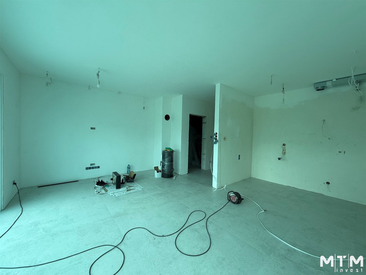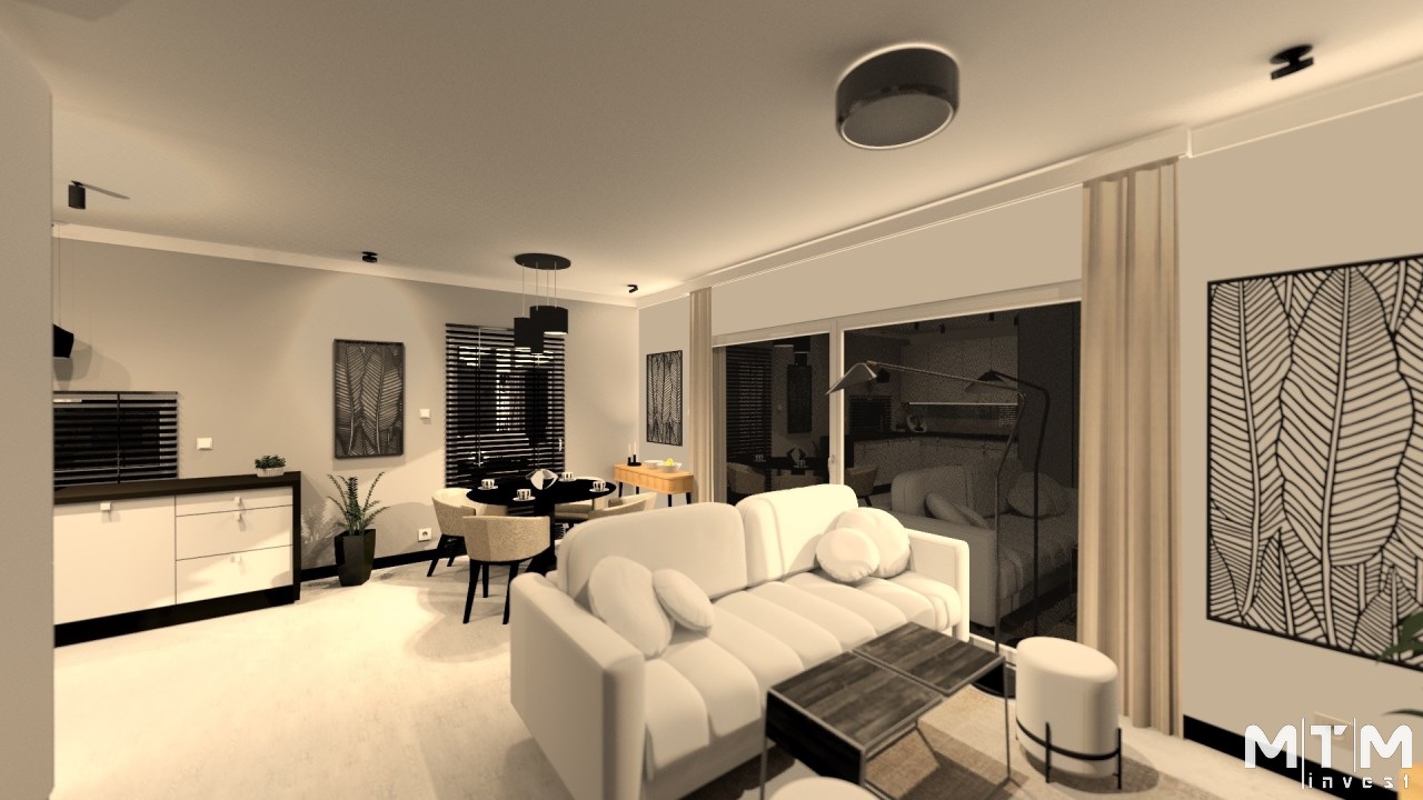 salon połączony z aneksem kuchennym, wyjście na duży taras, wc , z holu przejście do garażu.