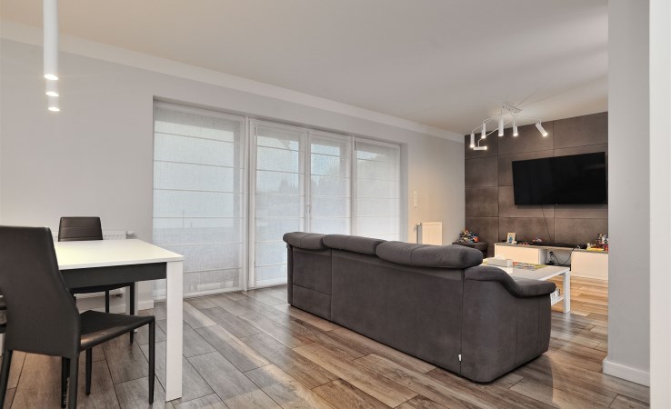 Okna Salamander bluEvolution, charakteryzujące się średnim współczynnikiem ciepła 0,75 W/m2*K, zamontowane w sposób zapewniający izolację termiczną. Antywłamaniowe drzwi wejściowe klasy RC2, z szybą w doświetleniu P4 marki "Wiśniowski". Bramy garażowe marki "Wiśniowski"; pokrycie dachu wysokiej jakości dachówką firmy "Brass". Kominy spalinowe dedykowane pod kominek marki "Hoch"; W całym domu ogrzewanie podłogowe z pompy ciepła. W budynku zamontowany system monitoringu.Cena nieruchomości zawiera podatek VAT w wysokości 23%, który może zostać odliczony przy zakupie na firmę.