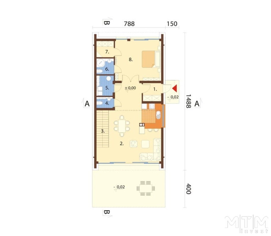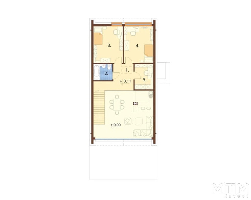 Z salonu można wyjść na taras i ogród, a także przejść na antresolę. Obok schodów na poddasze jest WC, a za nim pomieszczenie w którym jest kotłownia i pralnia. Ponadto wiatrołap, sypialnia z prywatną łazienką i garderobą.