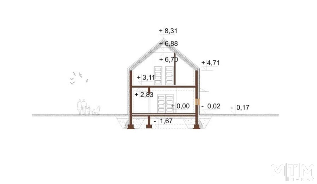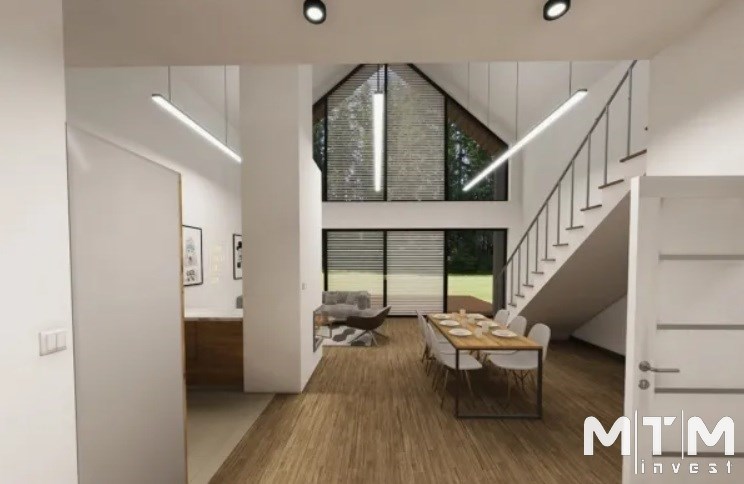 Ergonomiczny dom, zaprojektowany z myślą o praktycznych aspektach użytkowania, utrzymany w stylistyce nowoczesnej stodoły. Posiada duże przeszklenia w elewacjach bocznych, co sprawia że jest bardzo słoneczny i przytulny. Przeszklenia wraz z tarasem i ogrodem od strony południowo-zachodniej, widok na pola i lasy dzięki braku sąsiadujących działek budowlanych, dla osób ceniących prywatność.