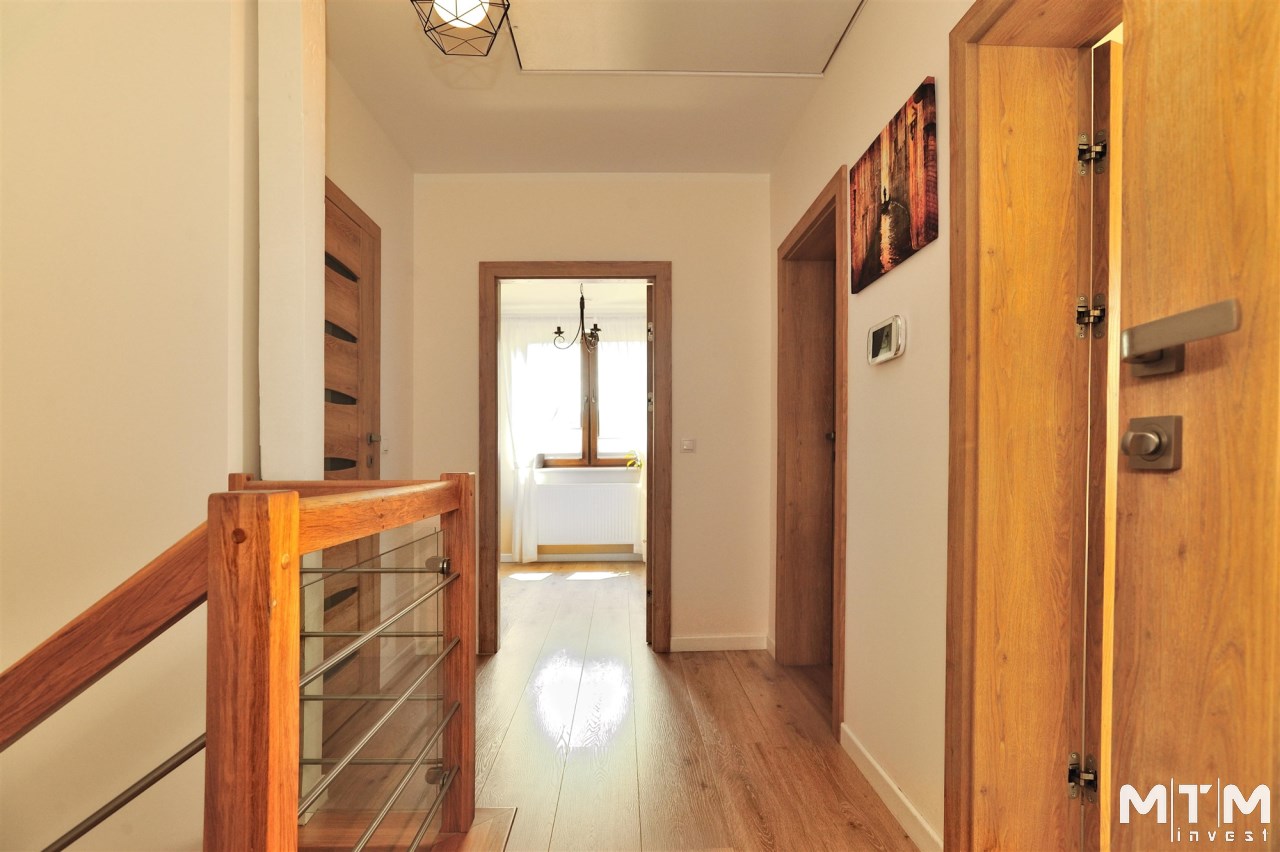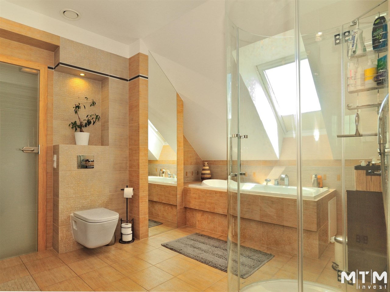 Na górze mamy trzy pokoje: w tym sypialnia z garderobą, duża łazienka z prysznicem oraz wanną,
