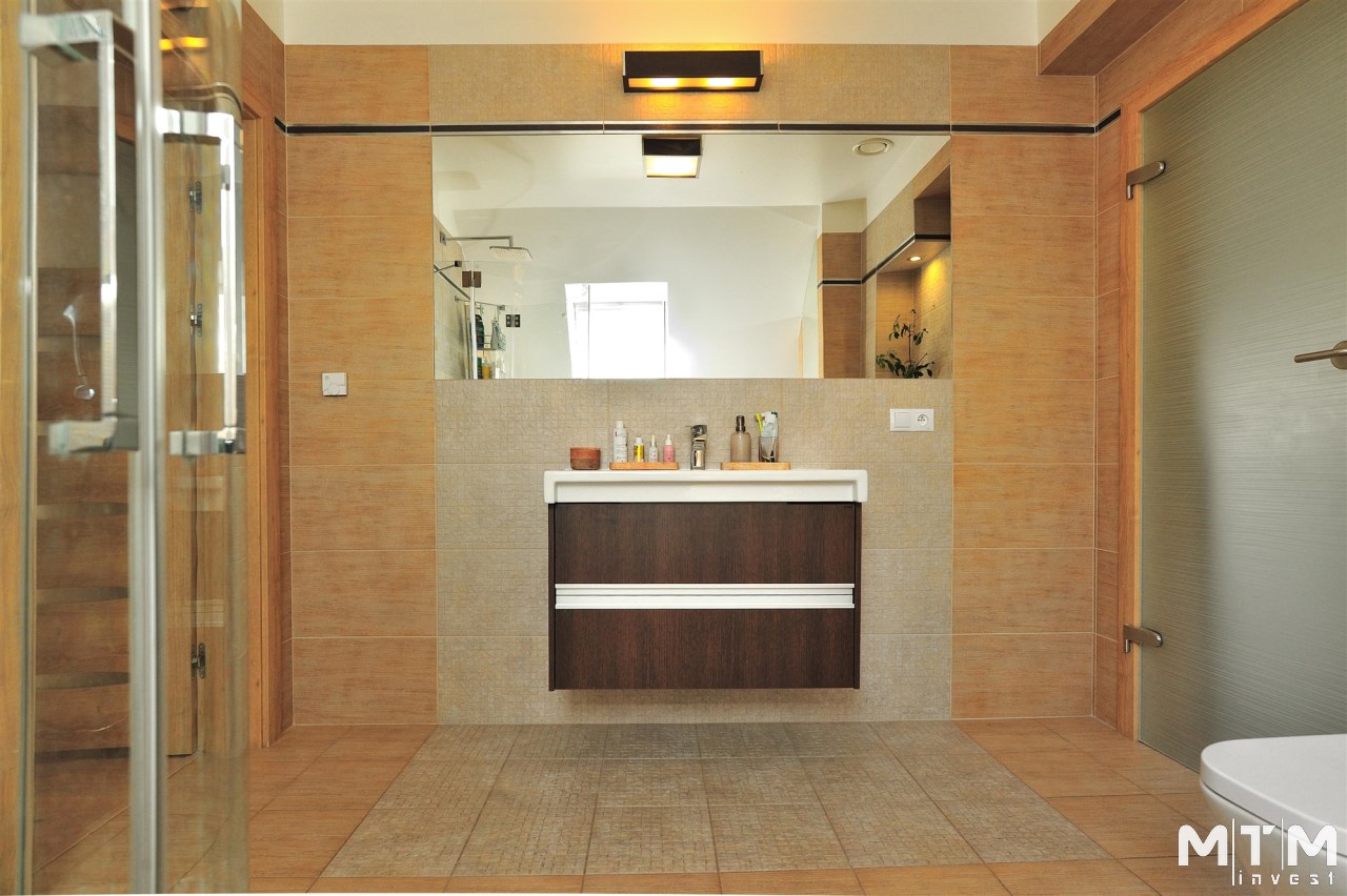 Na podłogach panele w klasie wytrzymałości C5 oraz korytarz, dwie łazienki i kuchnia wykończone gresem i terakotą.