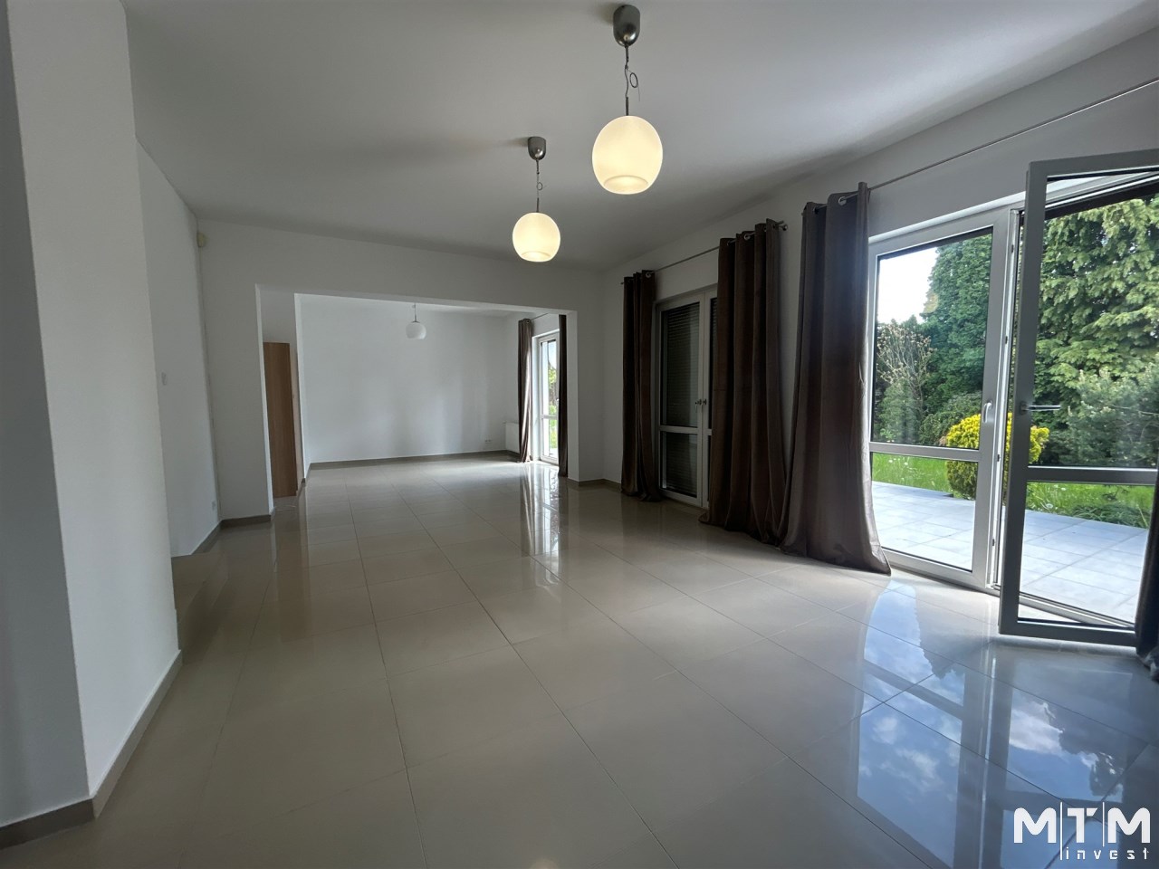 Duży, jasny salon z wyjściem na taras i ogród