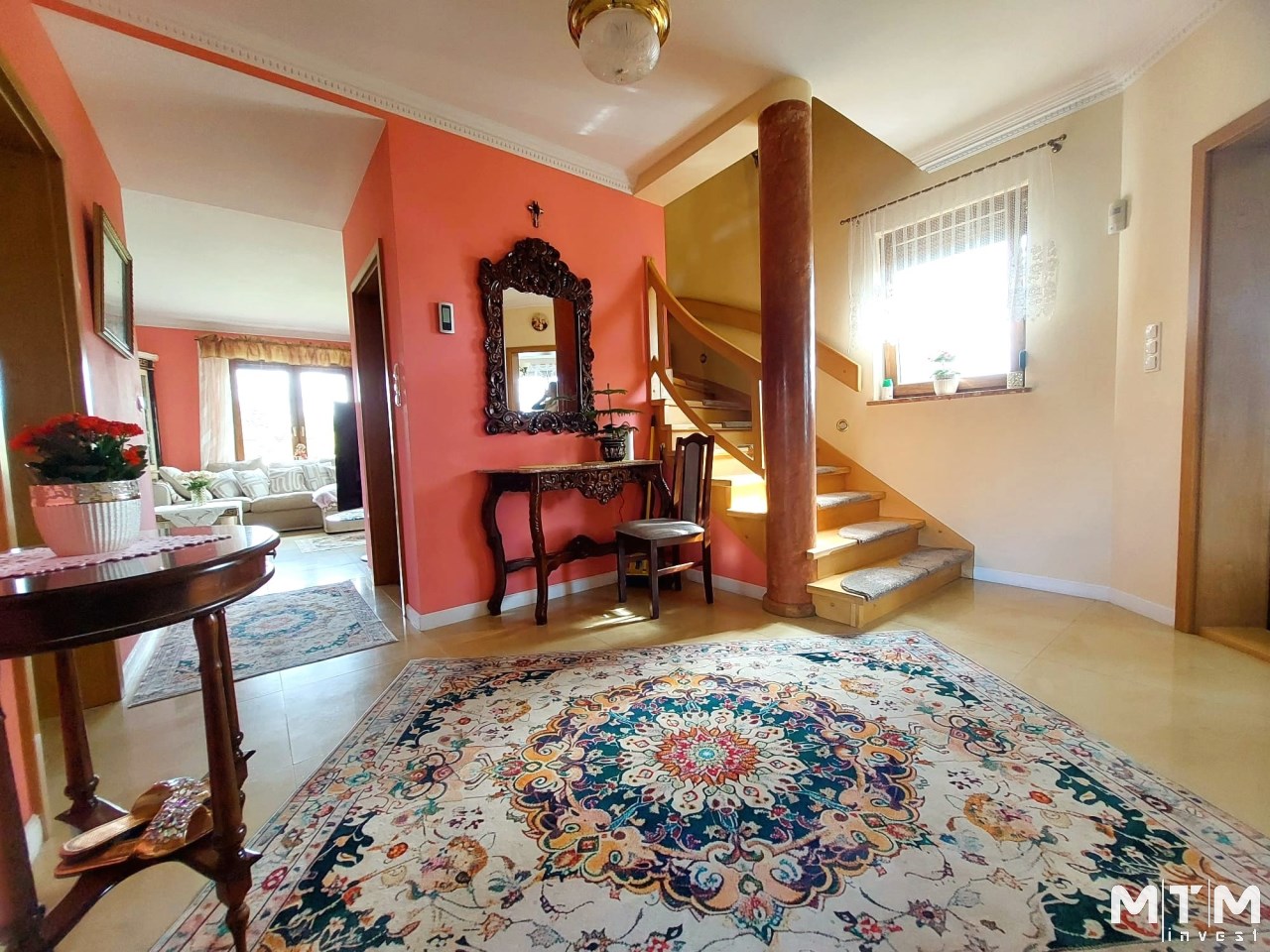 Na piętro prowadzą reprezentacyjne, szerokie drewniane schody z dodatkowym oknem doświetlającym klatkę schodową.