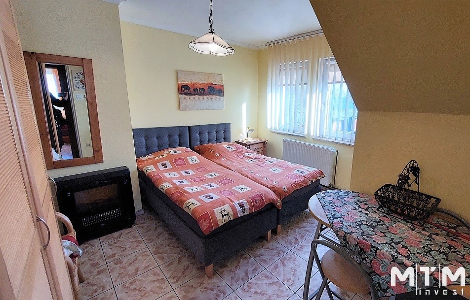 Układ na piętrze i poddaszu jest taki, że są po 2 apartamenty 2 pokojowe z łazienkami. Parter/przyziemie stanowi część jadalniano-świetlica a pozostałe pomieszczenia mogą stanowić dodatkową część mieszkalną z 2 pokojami, kuchnią i łazienką np dla zarządzających. Na tym poziomie z wejściem z zewnątrz jest pomieszczenie gospodarcze/kotłownia . Możliwość nocowania minimum 16 osób jednorazowo.