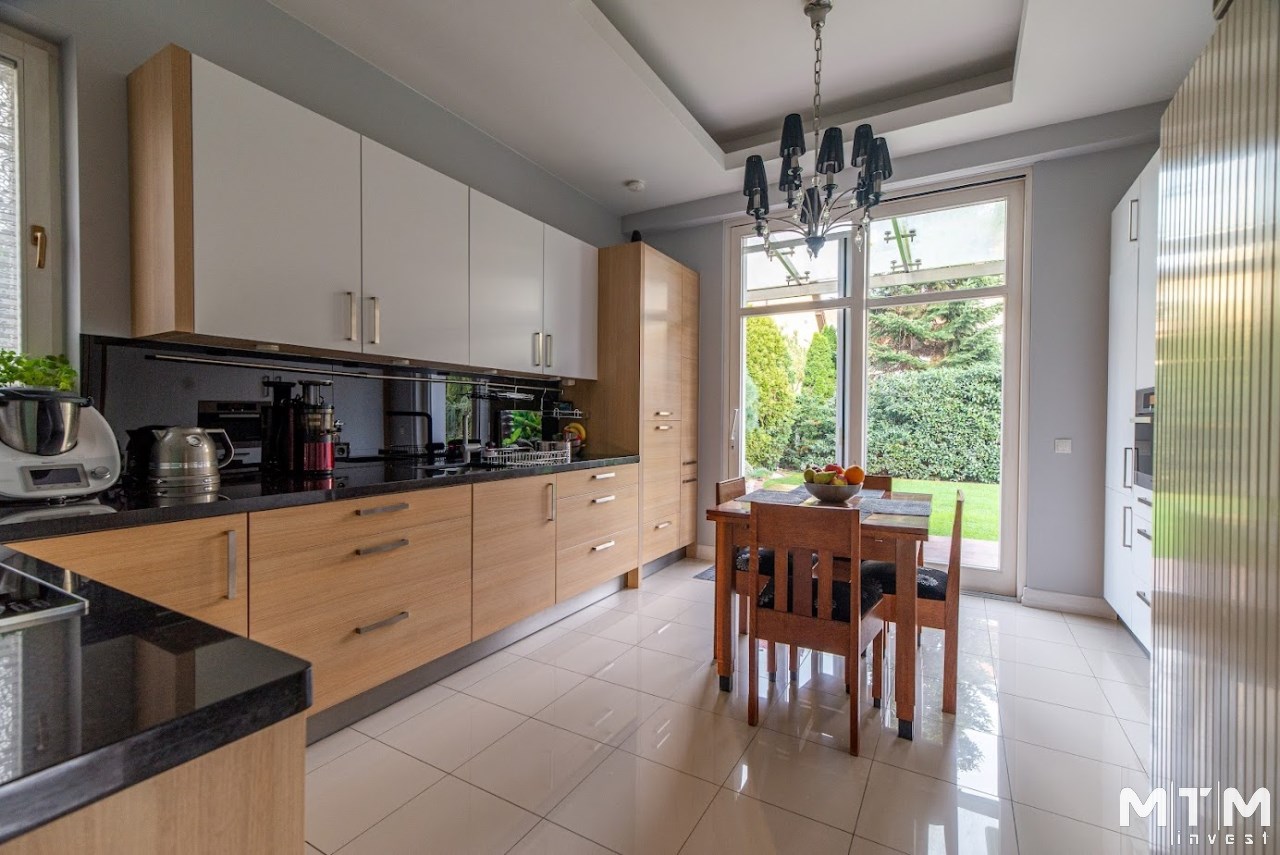 Z kuchni i jadalni można wyjść bezpośrednio na taras z widokiem na ogród — idealne miejsce na poranną kawę lub spotkania z bliskimi.