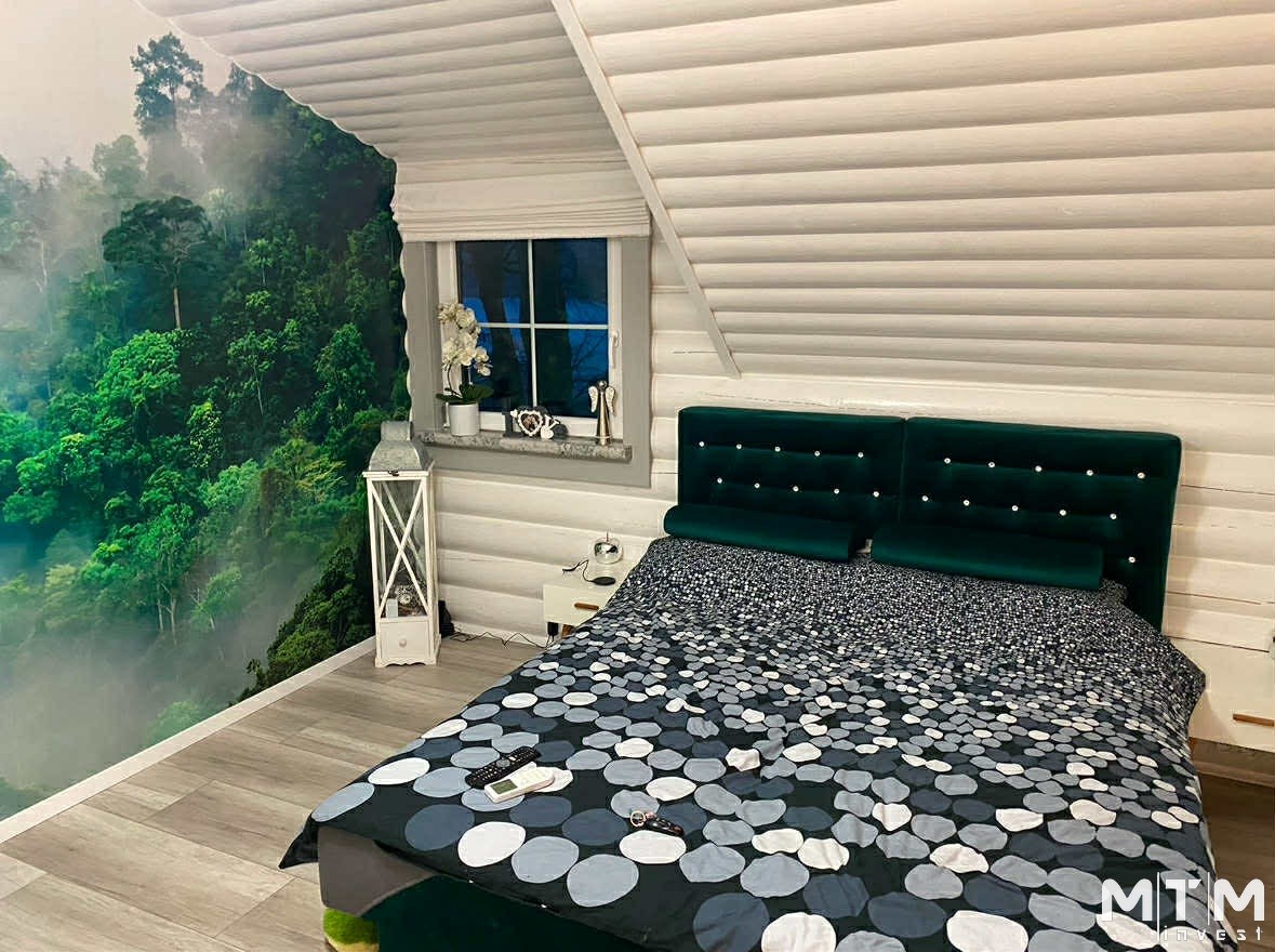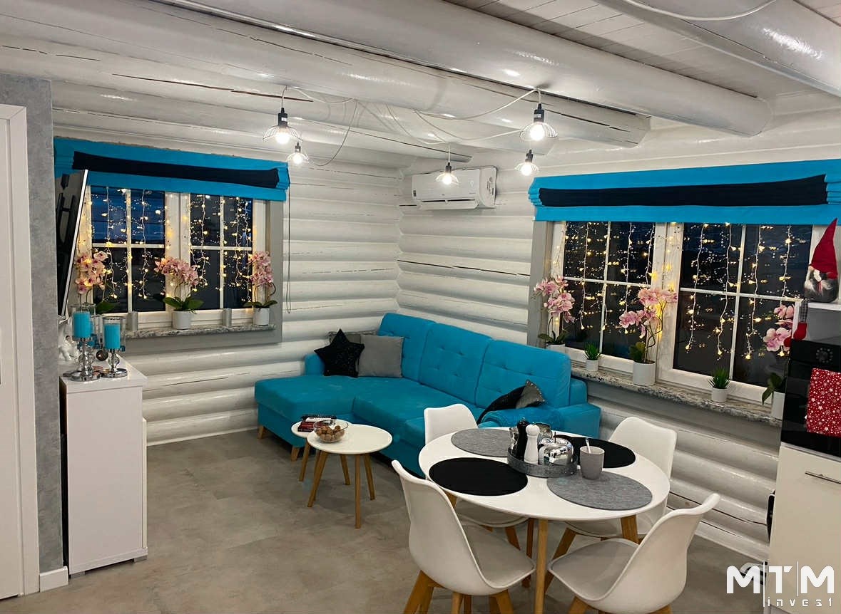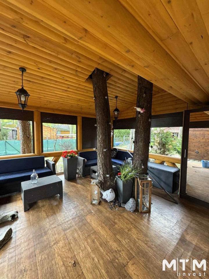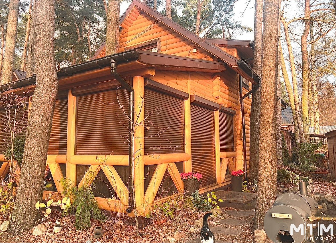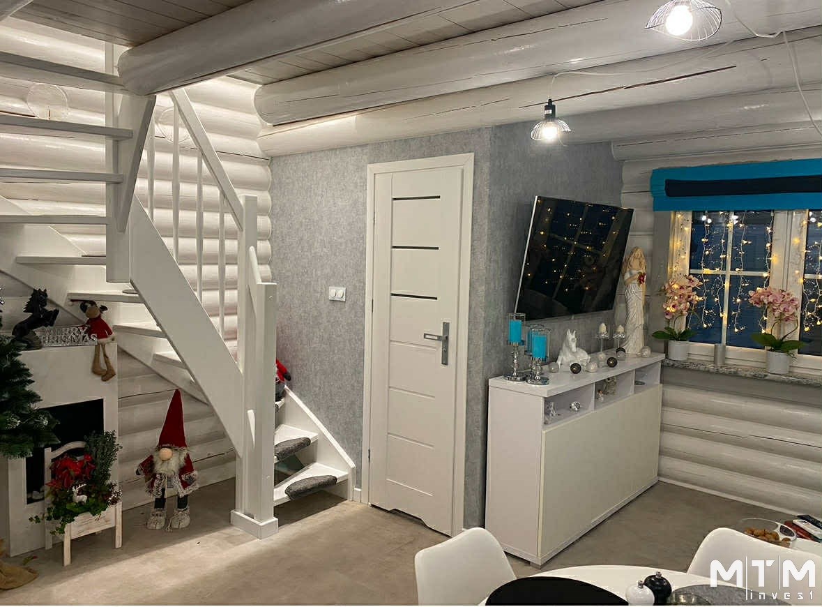 Dom wykonany z naturalnego bala drewnianego tworzy niepowtarzalny klimat – ciepły, przytulny i harmonijnie wpisujący się w otoczenie lasów i jeziora. Duże przeszklenia zapewniają doskonałe doświetlenie wnętrza i widok na zieleń.