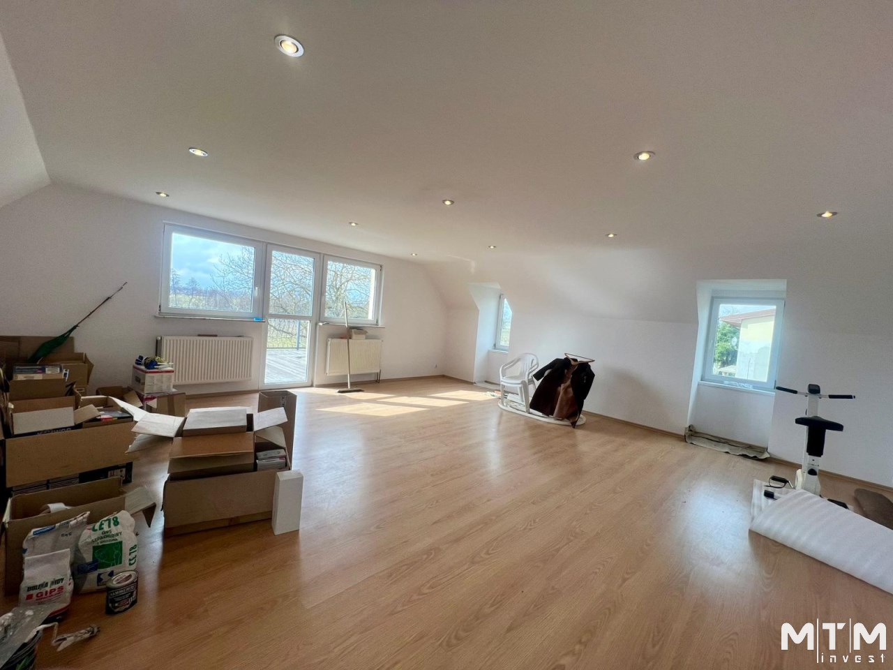Na górnej kondygnacji znajduje się dodatkowa przestrzeń obejmująca m.in. pokoje, garderobę, łazienkę oraz duży taras.