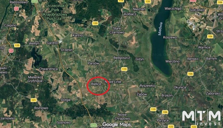 Kompleks działek budowlanych o powierzchniach 999/991/1128/1072/1049/1097/1202/1054/1135/1148/1140/1164/1167/1108/1114/1142/1095m2 w miejscowości gminnej Bielice pomiędzy miastami powiatowymi Szczecin, Gryfino, Pyrzyce, Stargard.