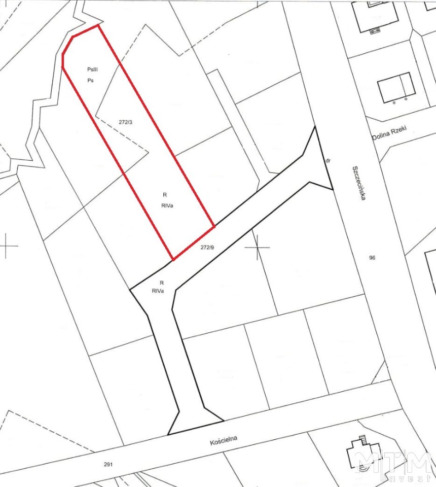 Działka w kształcie prostokąta, teren płaski, opadający w końcowej części w stronę strumienia Przęsocińska Struga, z dostępem do strumienia. Front działki 20 m, rodzaj użytku RIVa, PsIII. W cenie udział 1/13 w działce drogowej umożliwiającej dostęp do drogi publicznej w ul. Kościelnej lub Szczecińskiej.