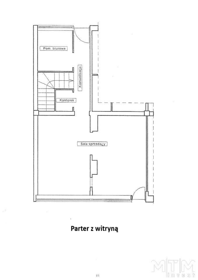 Parter: sala główna z witryną, biuro oraz kantorek. Łączna powierzchnia parteru 48,70 m2.