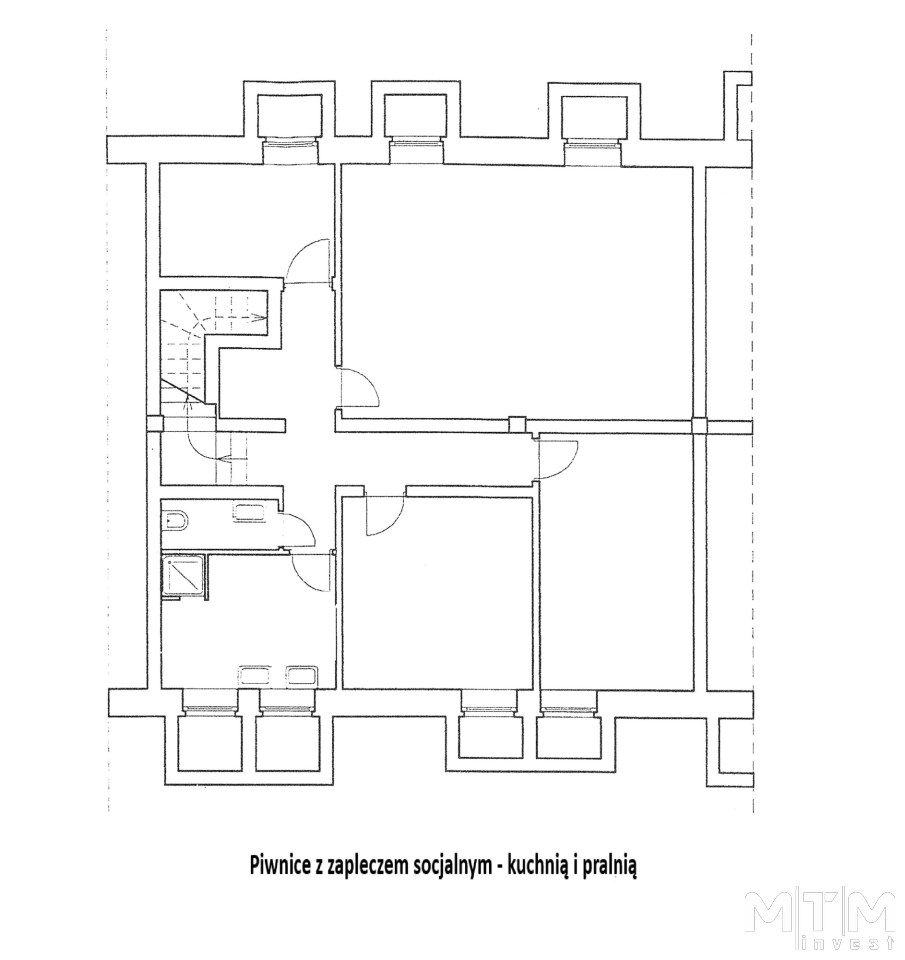 Piwnica: cztery pomieszczenia magazynowe, zaplecze socjalne z kuchnią i pralnią oraz wc. Łączna powierzchnia piwnic 81,30 m2.