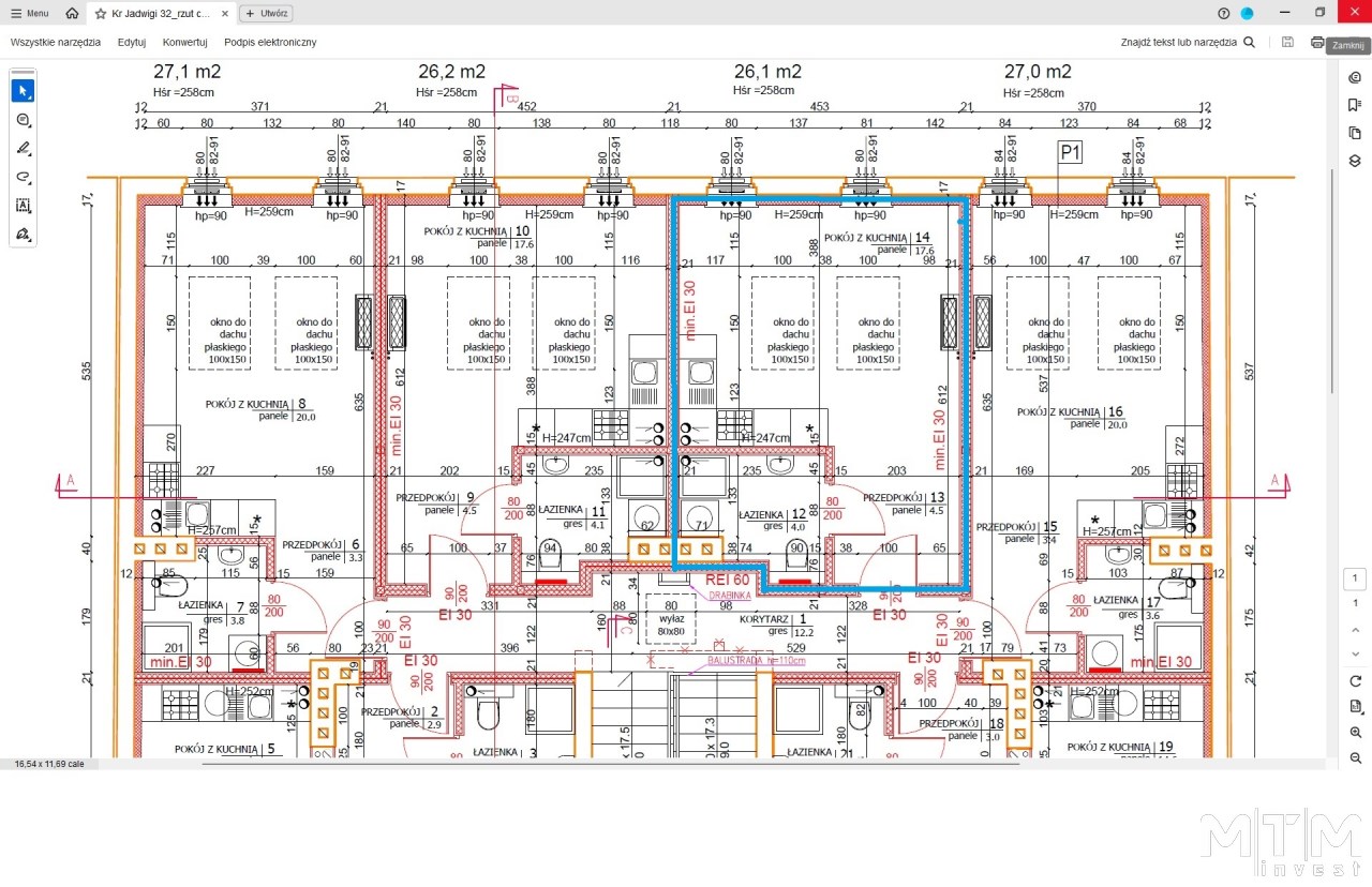 Mieszkanie o jednostronnej, zachodniej ekspozycji okien. Powierzchnia użytkowa wg. dokumentacji projektowej to 26,10 m2.