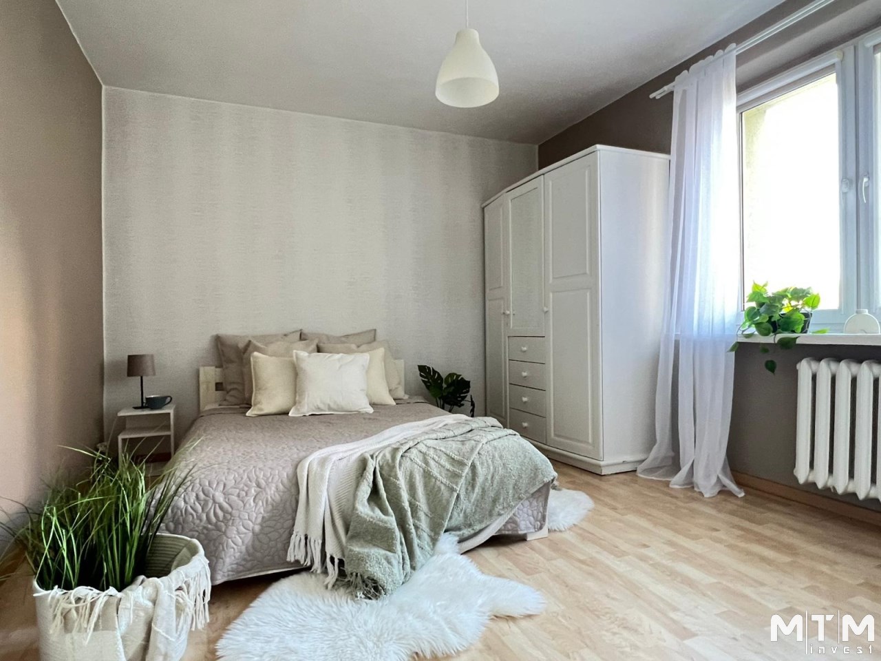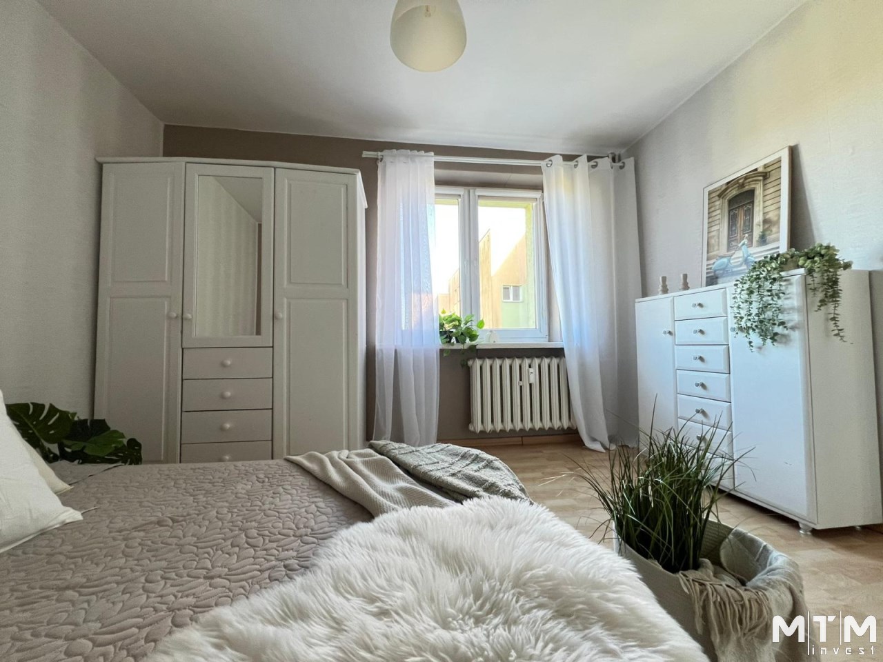 Sypialnia jest przestronna i dobrze doświetlona, tworząc komfortową przestrzeń do odpoczynku.