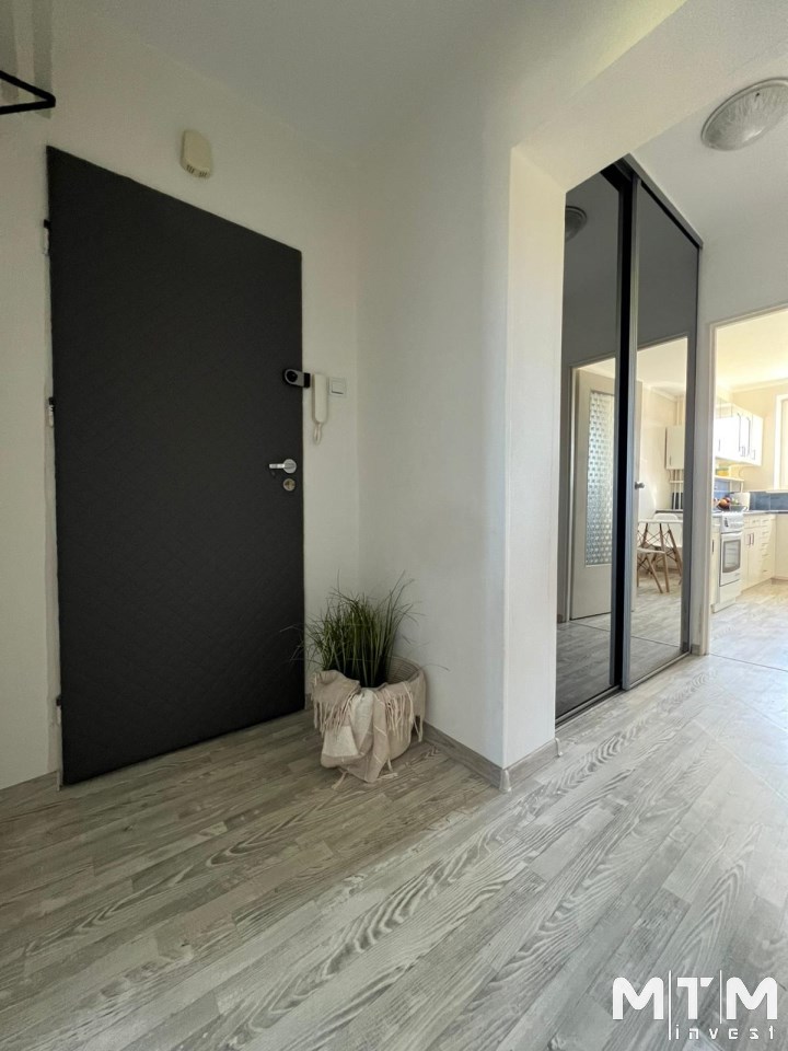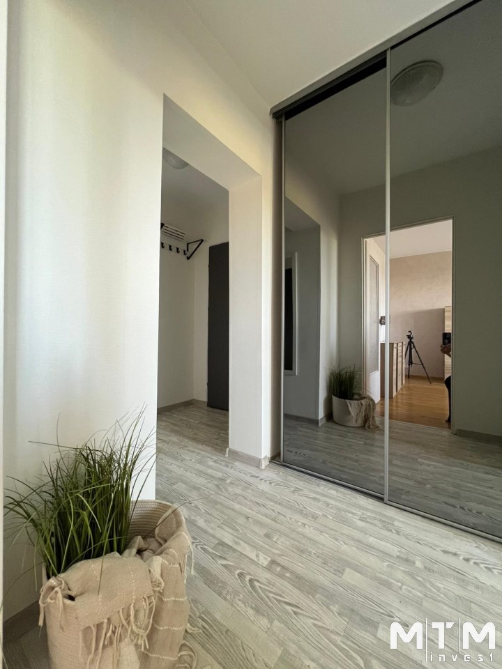Przedpokój wyposażony jest w obszerną szafę w zabudowie z lustrami, oferując dużo miejsca do przechowywania i optycznie powiększając przestrzeń.