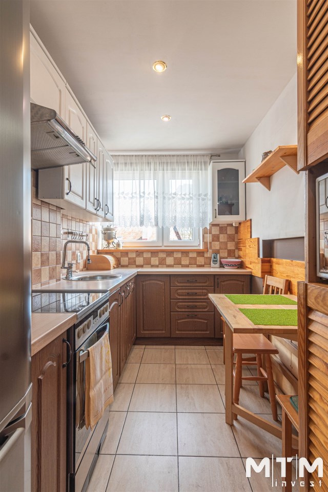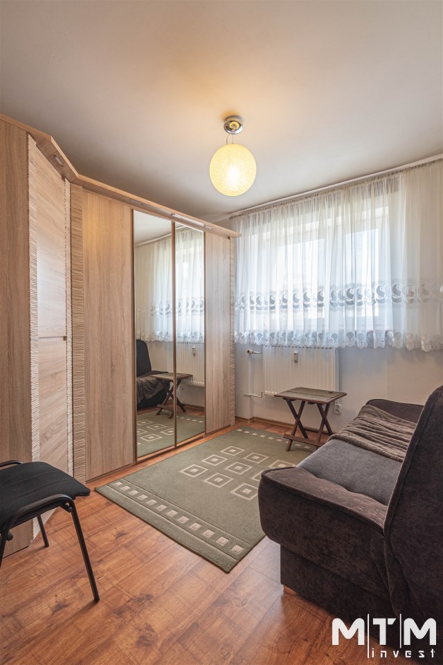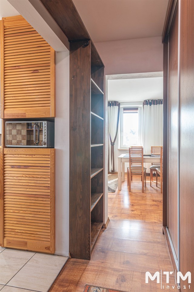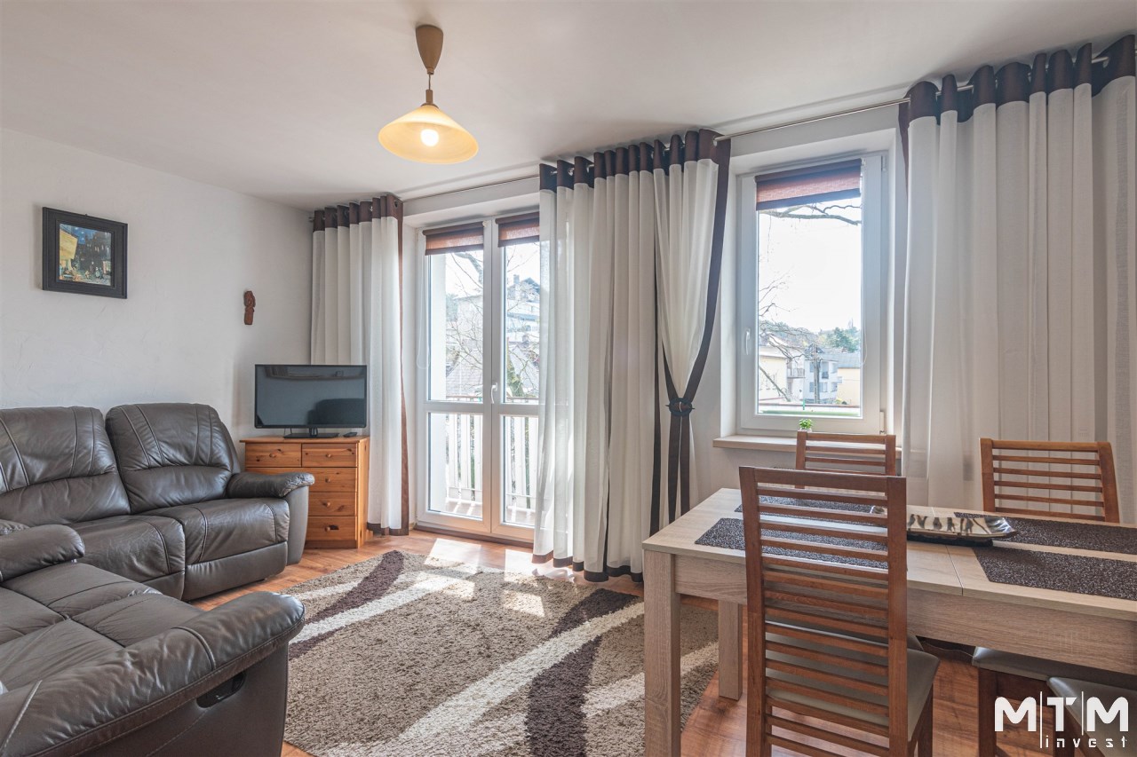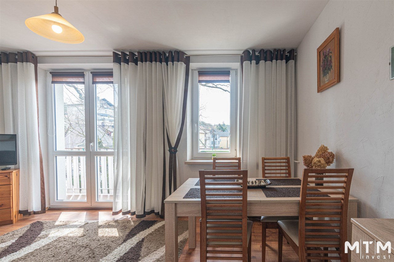 Mieszkanie rozkładowe, z dużego pokoju wyjście na balkon, osobna kuchnia z oknem, łazienka z wc, kabina prysznicowa. W łazience pralka. Ekspozycja okien: duży pokój południowy zachód, obie sypialnie i kuchnia południowy wschód. Mieszkanie kompletnie umeblowane i wyposażone. W kuchni sprzęt AGD: lodówka, kuchenka elektryczna, piekarnik elektryczny, okap, kuchenka mikrofalowa.