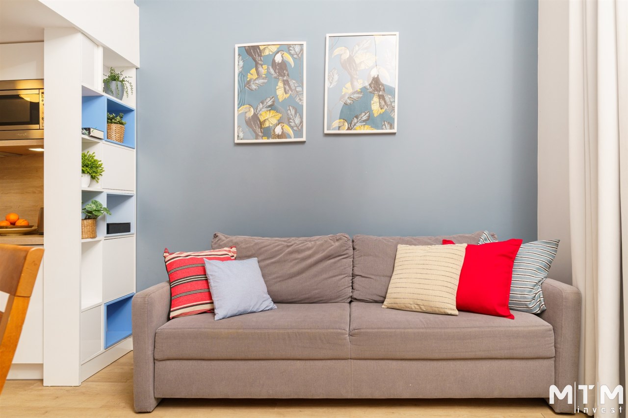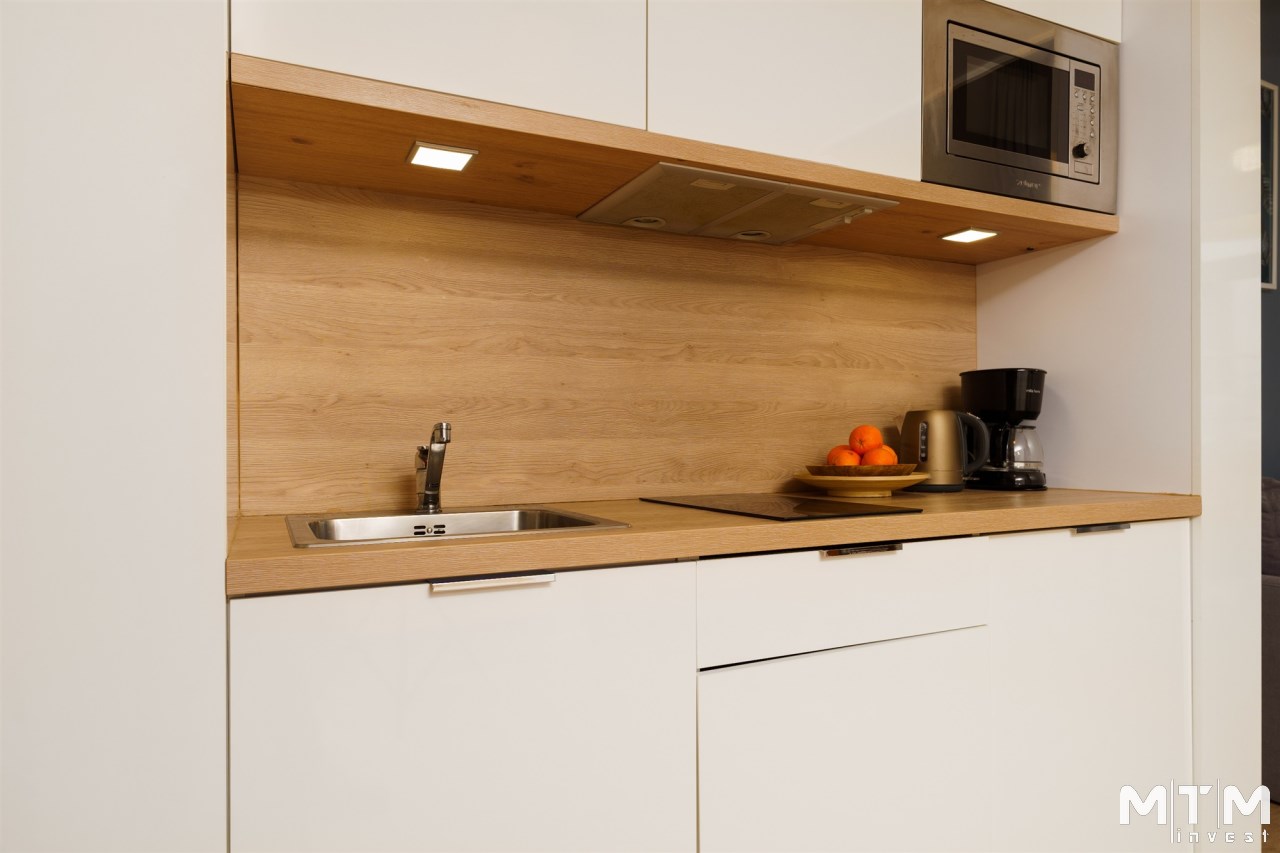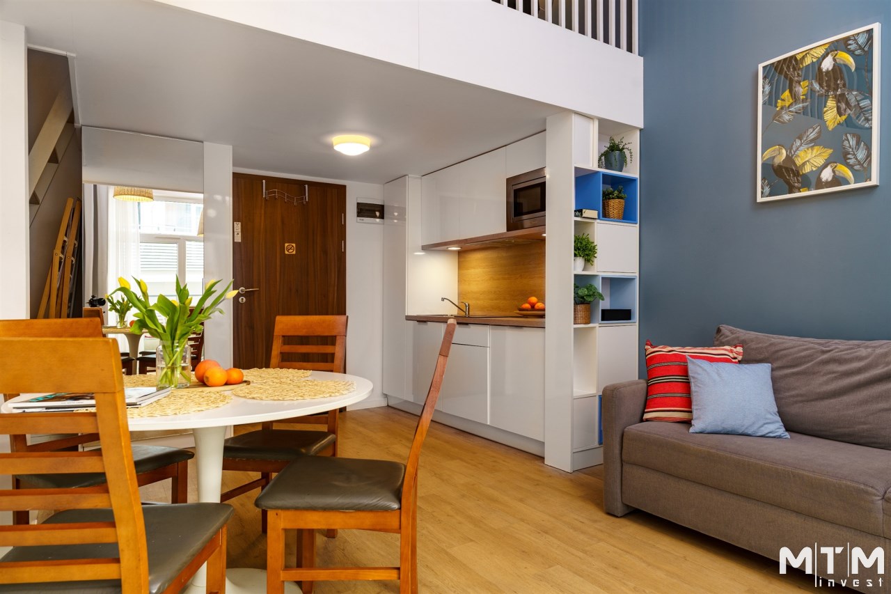 Funkcjonalne studio z antresolą zostało zaprojektowane z myślą o maksymalnym komforcie gości. Na antresoli znajduje się dwuosobowe łóżko oraz telewizor, natomiast w części dziennej – rozkładana sofa, stół z krzesłami oraz drugi telewizor. Lokal pomieści 4 osoby, co znacząco zwiększa jego potencjał najmu. Do dyspozycji jest również w pełni wyposażony aneks kuchenny (lodówka, płyta kuchenna, pochłaniacz i kuchenka mikrofalowa). Całość uzupełnia balkon z bocznym widokiem na morze.