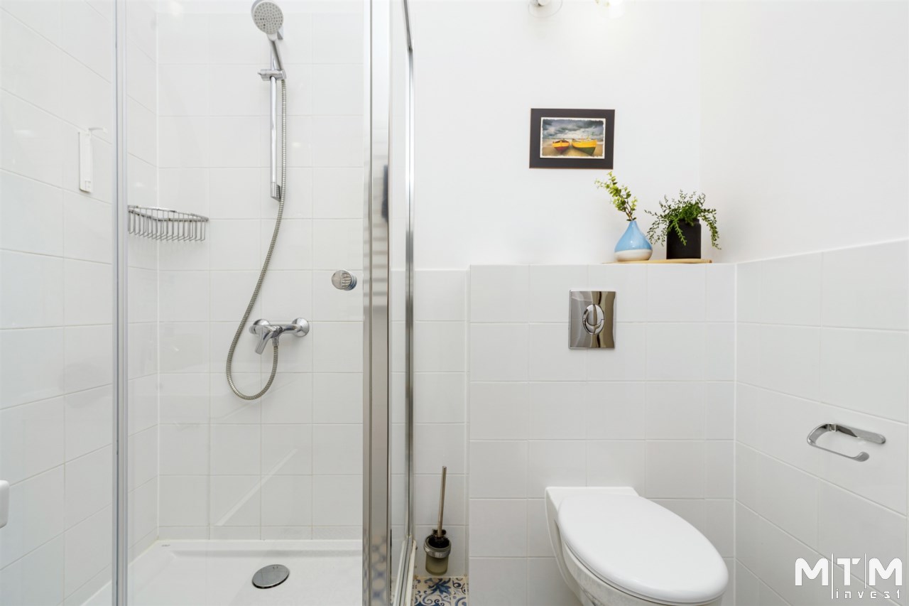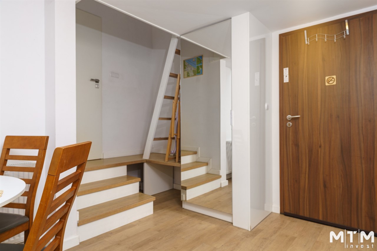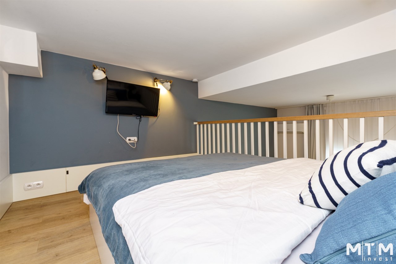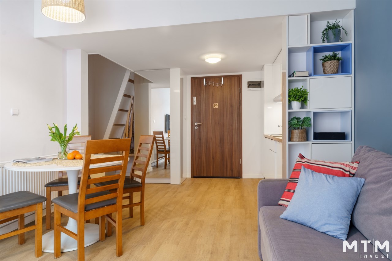 Funkcjonalne studio z antresolą zostało zaprojektowane z myślą o maksymalnym komforcie gości. Na antresoli znajduje się dwuosobowe łóżko oraz telewizor, natomiast w części dziennej – rozkładana sofa, stół z krzesłami oraz drugi telewizor. Lokal pomieści 4 osoby, co znacząco zwiększa jego potencjał najmu. Do dyspozycji jest również w pełni wyposażony aneks kuchenny (lodówka, płyta kuchenna, pochłaniacz i kuchenka mikrofalowa). Całość uzupełnia balkon z bocznym widokiem na morze.