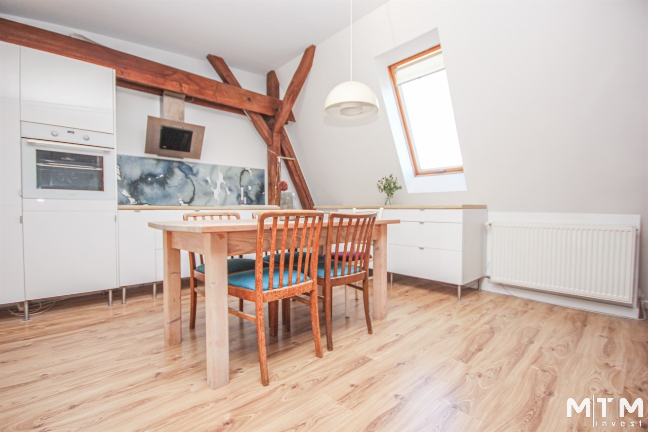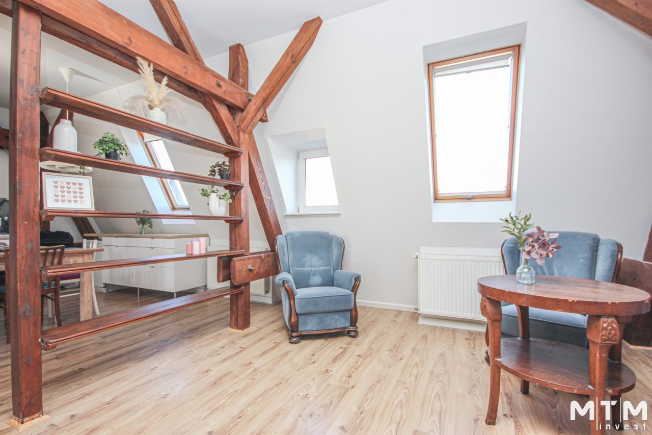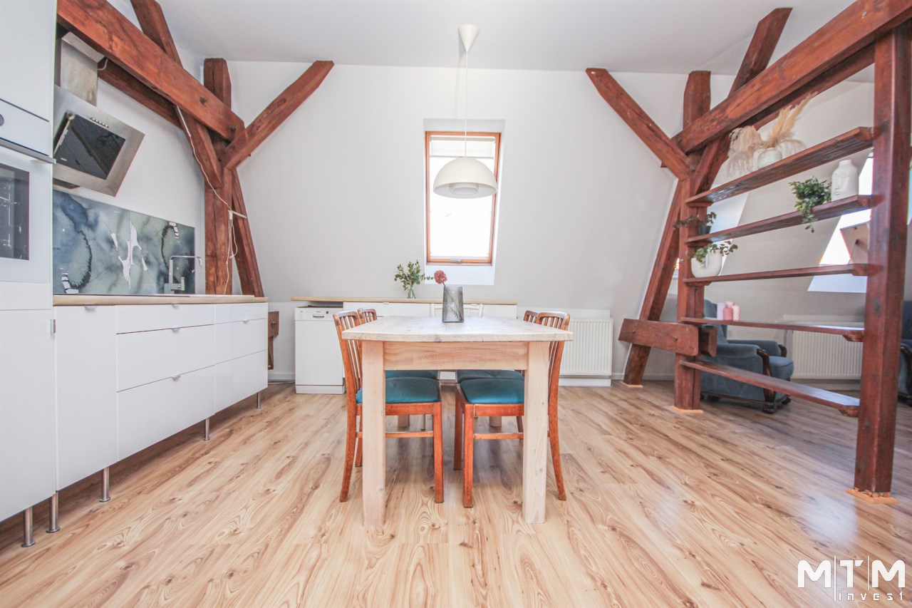 Mieszkanie jest adaptacja poddasza ( przeprowadzona około 2000 roku ), znajduję się na IV piętrze, a w skład jego wchodzą: