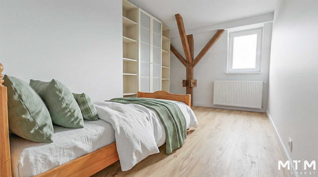 - duża sypialnia z podwójnym łóżkiem i miejscem na szafę