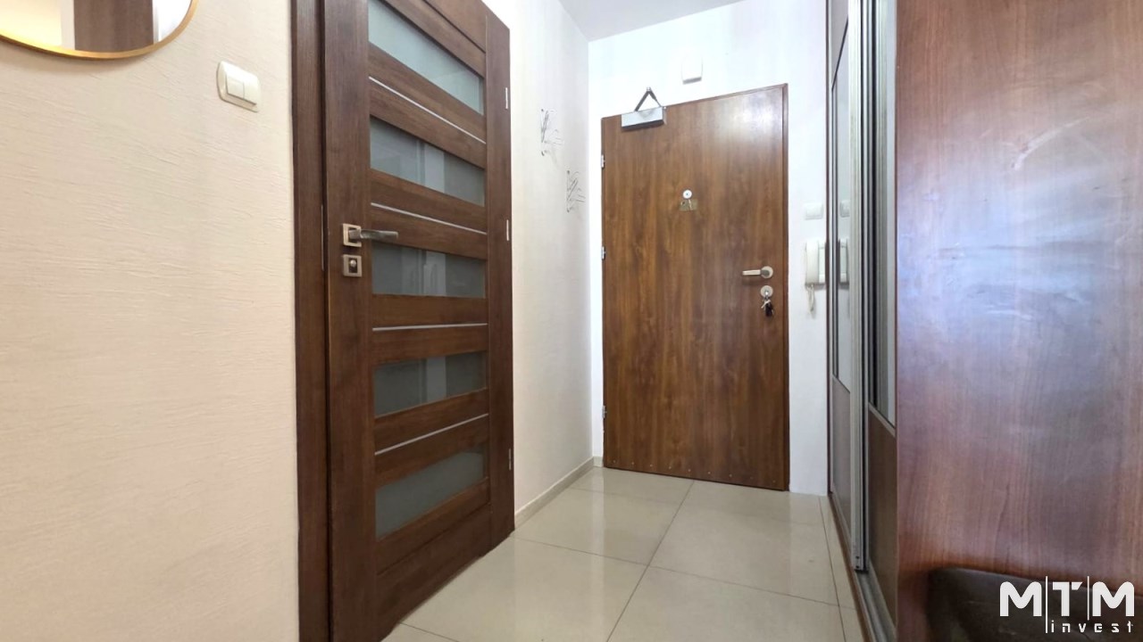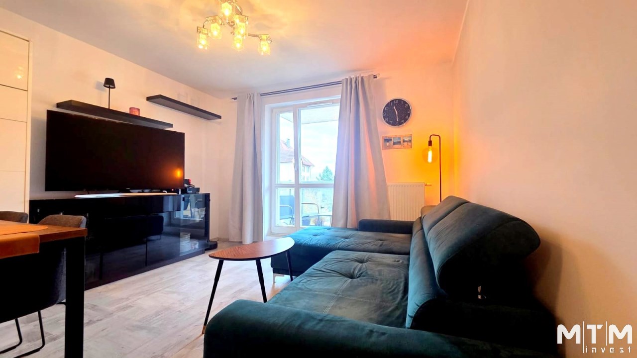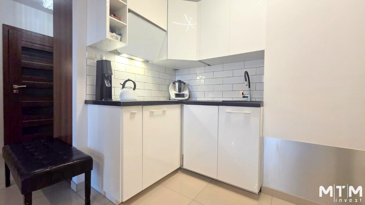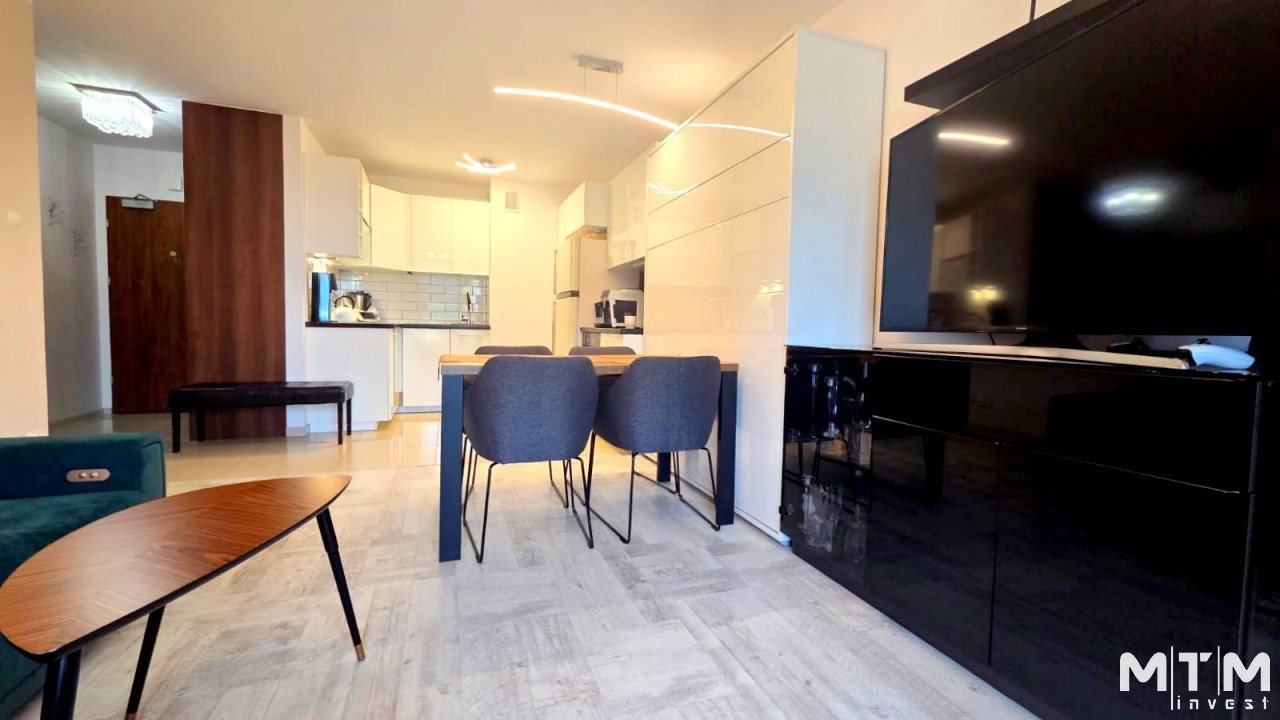 Składa się z przestronnego salonu, w którym oprócz wygodnego narożnika znajduje się pełnowymiarowe łóżko chowane w eleganckiej zabudowie meblowej w połysku – praktyczne rozwiązanie, które pozwala zachować przestrzeń i estetykę wnętrza. Kuchnia jest osobna, w pełni wyposażona i gotowa do użytku, natomiast w łazience znajduje się wanna oraz pralka. W przedpokoju umieszczono dużą szafę w zabudowie, co dodatkowo zwiększa funkcjonalność mieszkania.