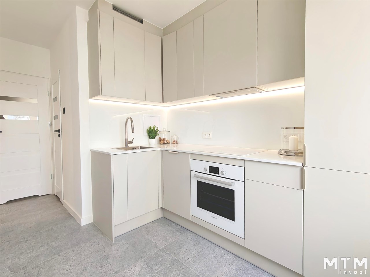 Osobna kuchnia z oknem – wykonana na wymiar przez stolarza, w pełni wyposażona w nowy sprzęt AGD (płyta indukcyjna, piekarnik, lodówka, zmywarka) oraz efektowne podświetlenie LED.
