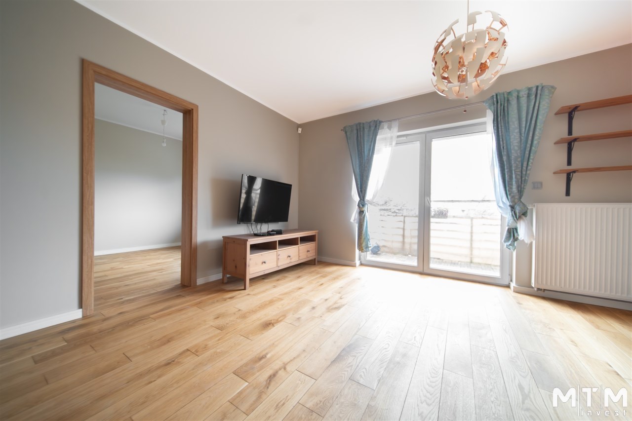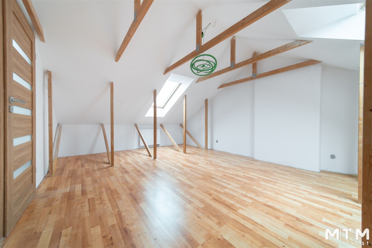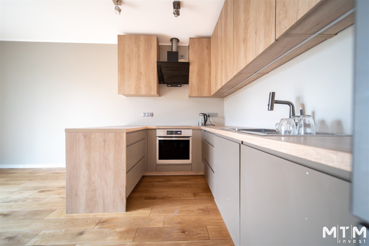 Mieszkanie wykończone w wysokim standardzie, z dbałością o detale i funkcjonalność. Dębowa podłoga oraz schody, nowoczesne oświetlenie, kuchnia wykonana na zamówienie, instalacja alarmowa. Zabudowy stałe – w przedpokoju oraz sypialni głównej – również robione na wymiar.