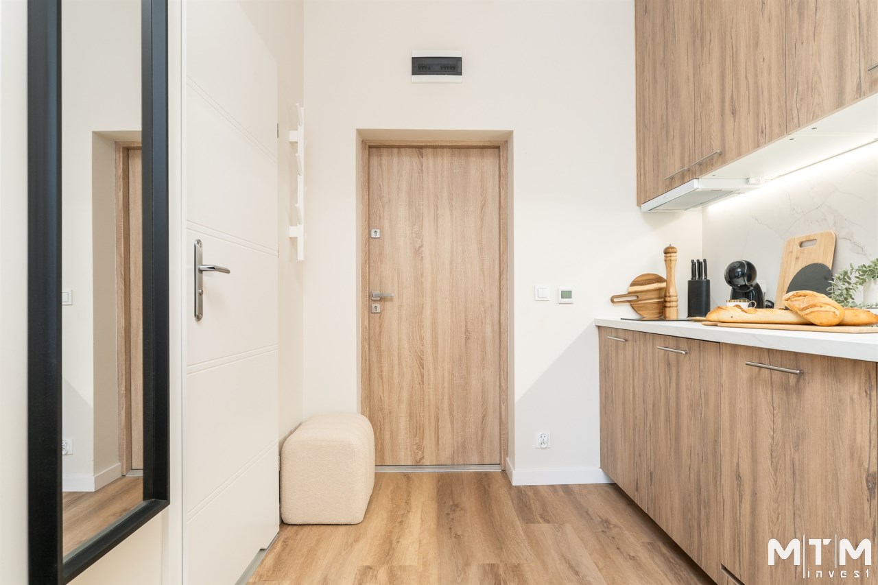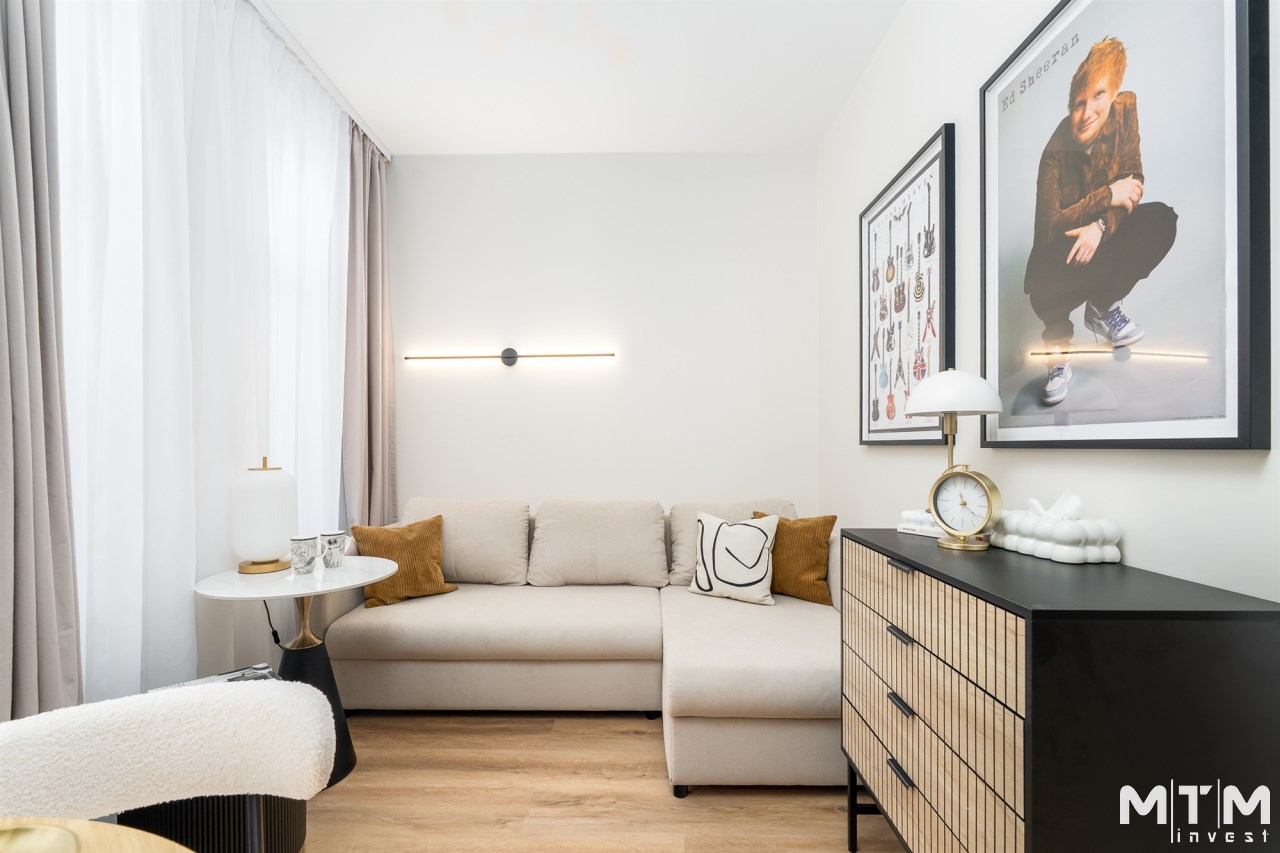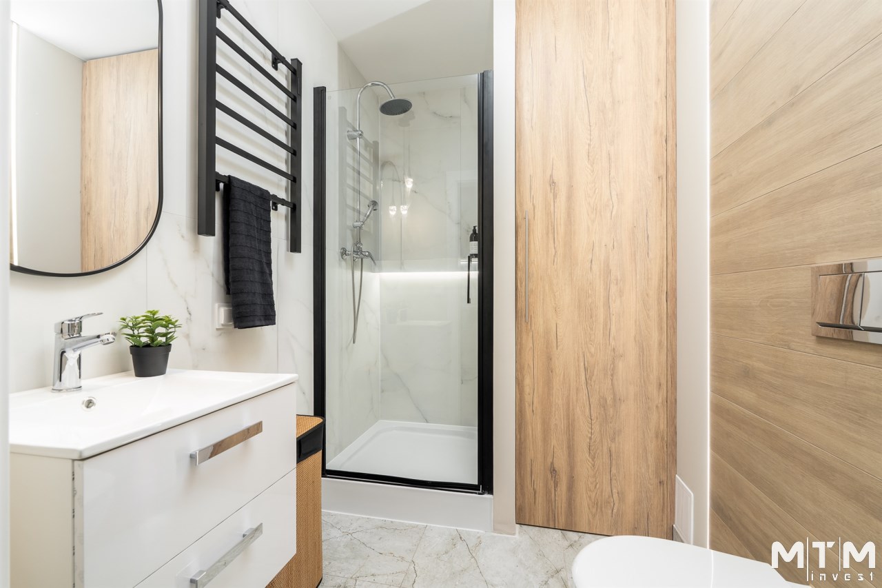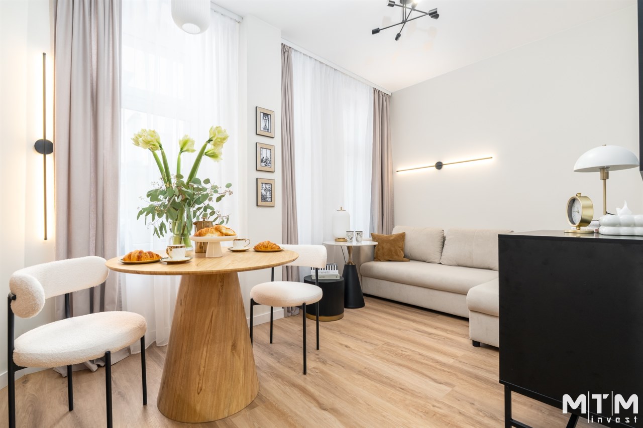 Mieszkanie po remoncie kapitalnym, o wschodniej ekspozycji okien. Pokój dzienny z aneksem kuchennym, łazienka i korytarz. W pokoju i korytarzu na podłodze panele, ściany wygładzone, malowane. W pokoju wypoczynek, stół, dwa krzesła, komoda oraz szafa ubraniowa. Łazienka w glazurze i terakocie, kabina prysznicowa, muszla podwieszana typu geberit, umywalka, meble łazienkowe, lustro, pralka. Kuchnia kompletnie umeblowana i wyposażona: lodówka podblatowa, płyta elektryczna, okap, zmywarka, mikrofala.