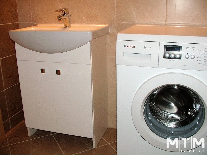 Wyposażenie łazienki | WC, umywalka, pralka, lustro, kabina natryskowa |