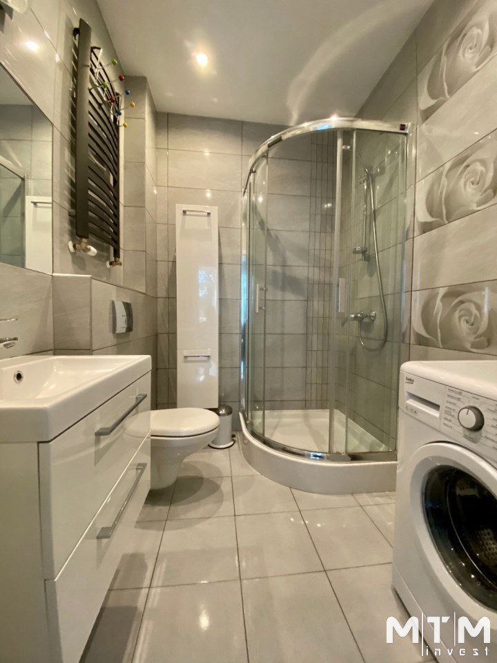 - łazienka z toaletą wyposażona w kabinę prysznicową (pralka na wyposażeniu).