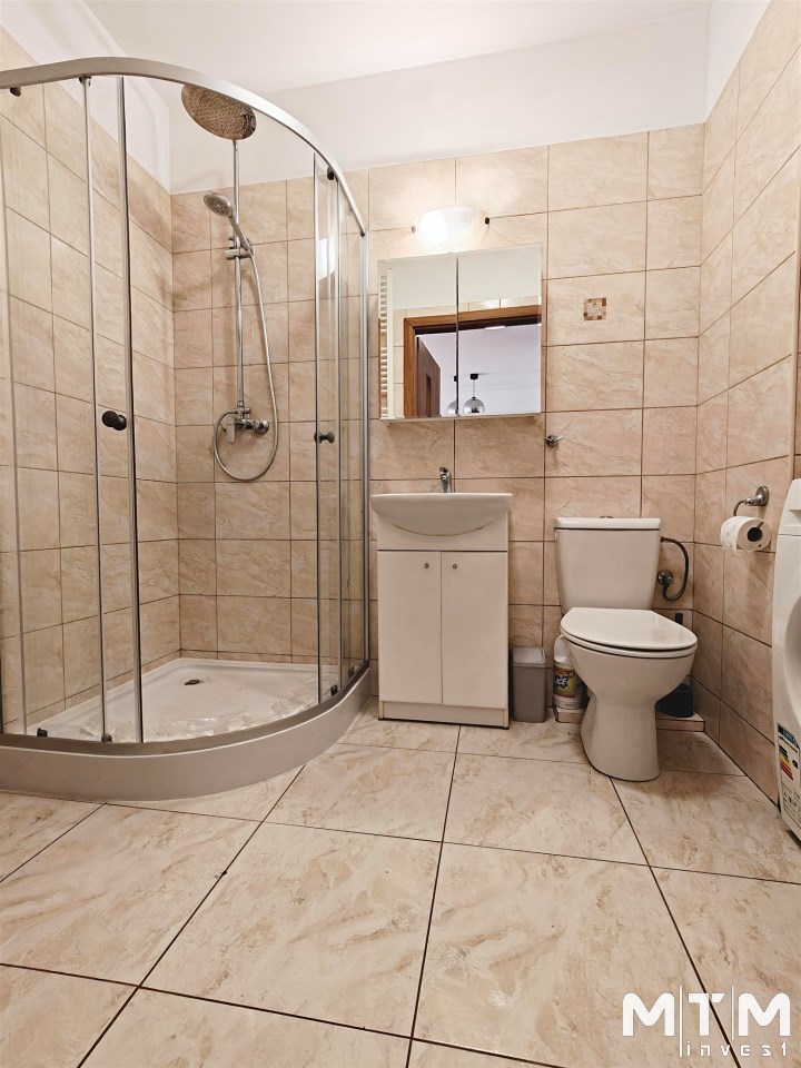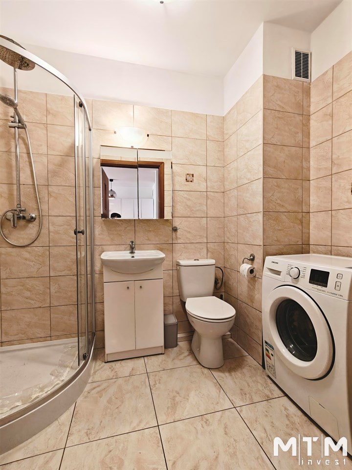 | Wyposażenie łazienki | kabina prysznicowa, lustro, pralka, umywalka na szafce, WC |