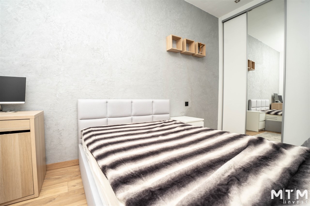 W salonie okrągły stol z krzesłami, rozkładana kanapa. W kuchni indukcja, zmywarka. Sypialnia z dużym łóżkiem oraz kącikiem do pracy (światłowód w całym mieszkaniu). Na jednej ścianie garderobiana szafa.