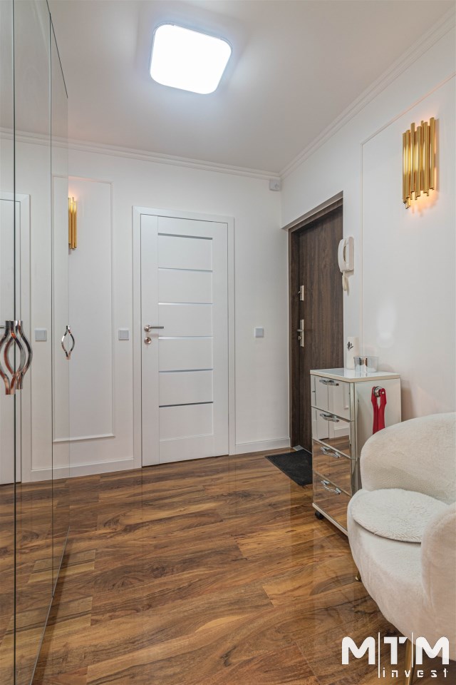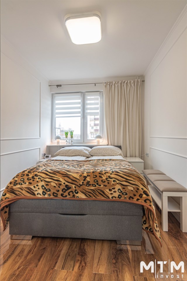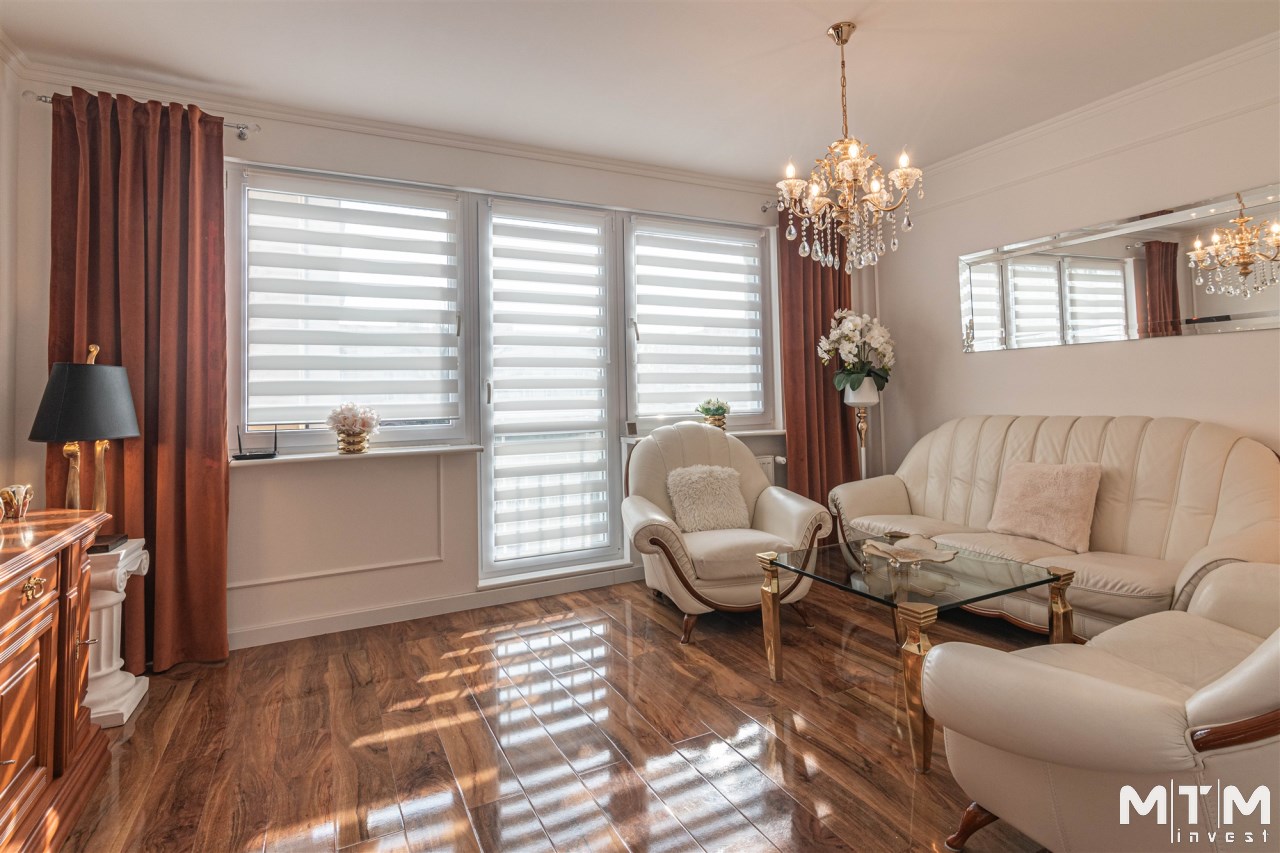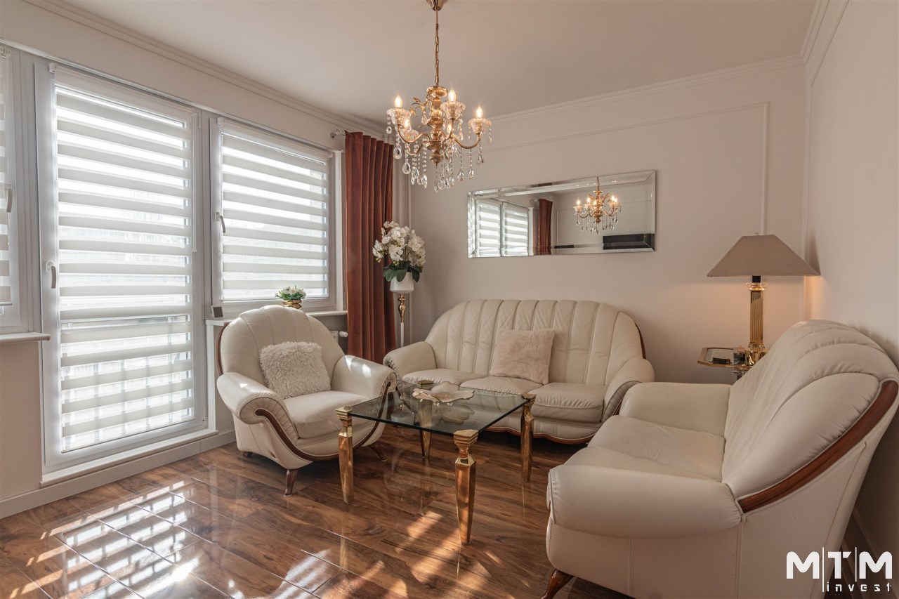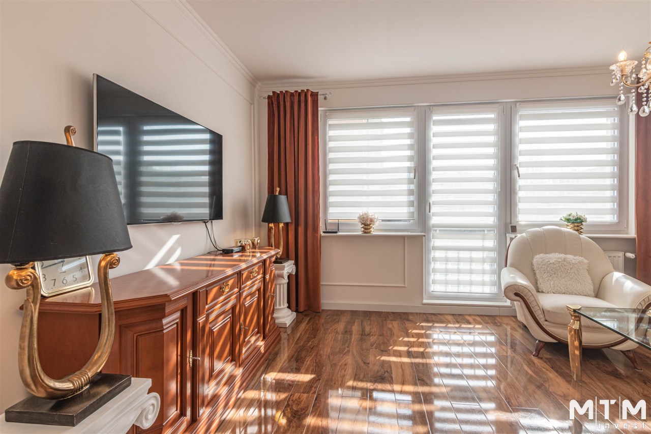 Mieszkanie kompletnie umeblowane i wyposażone; w dużym pokoju zestaw mebli skórzanych, komoda, odbiornik TV, w sypialni duże łóżko, szafa w zabudowie, odbiornik TV. Łazienka nowocześnie zaaranżowana z dużą kabiną prysznicową z krzesełkiem, wyposażona w pralkosuszarkę. W kuchni sprzęt AGD: lodówka z zamrażarką, płyta indukcyjna, piekarnik, okap, zmywarka. Dodatkowo zestaw sztućców, talerzy, garnków oraz innych urządzeń typu air-frayer, soda-strean, czajnik, itp. Mieszkanie wyposażone jest również w odkurzacz, suszarkę do ubrań, deskę do prasowania, żelazko, pościel oraz ręczniki.