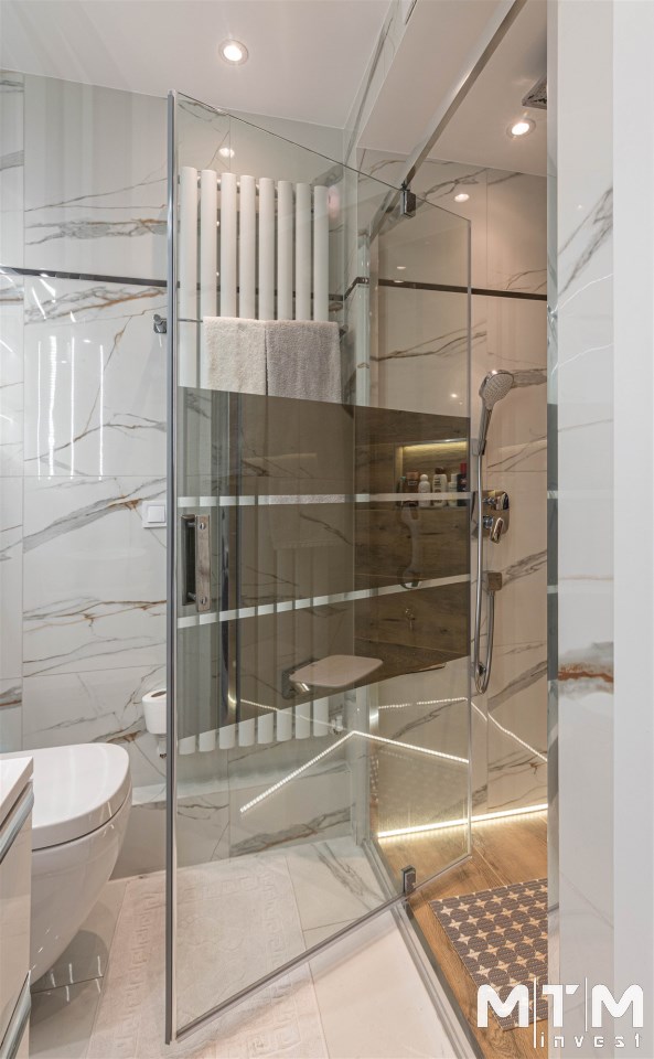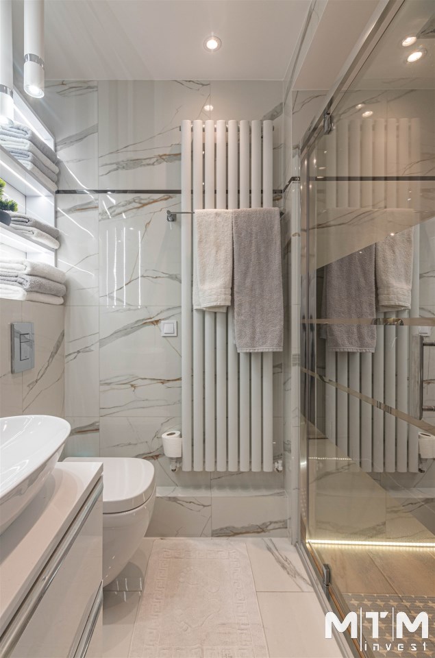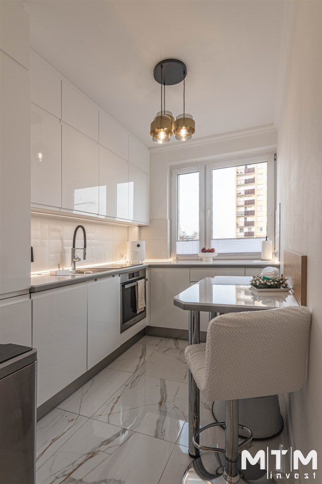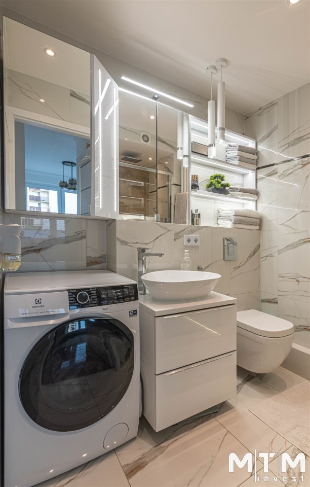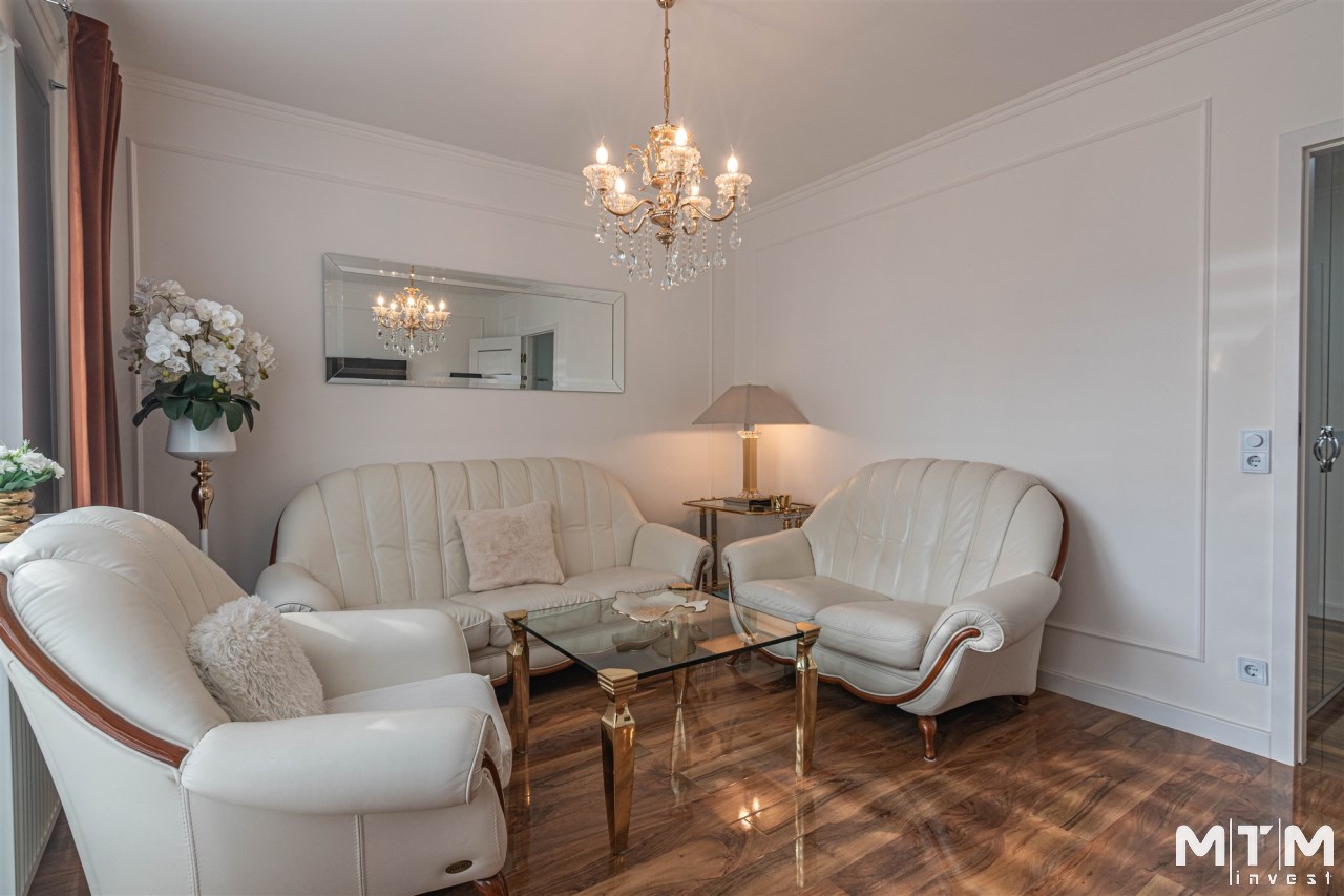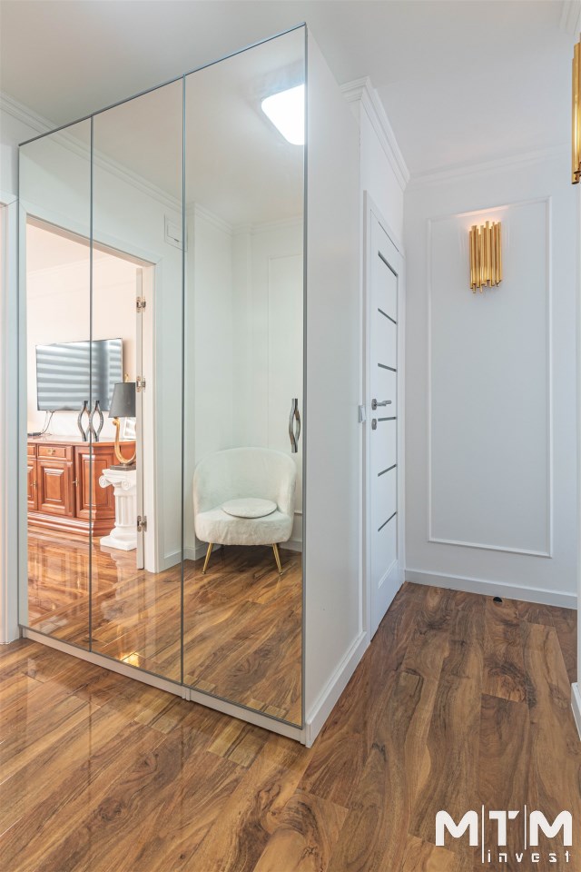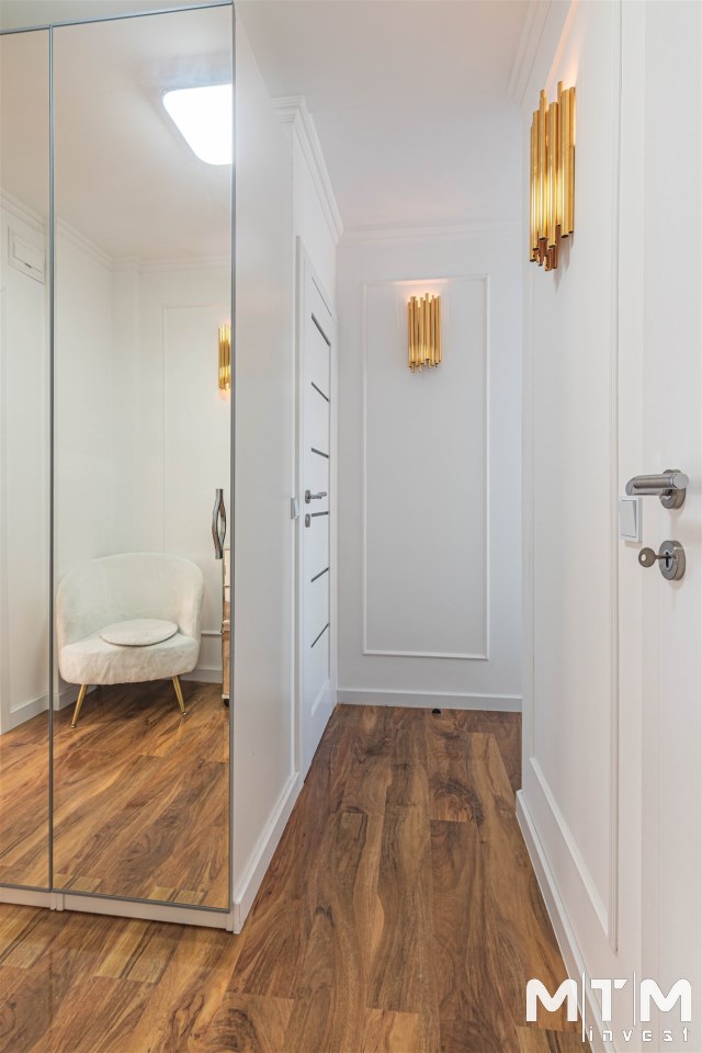 Mieszkanie kompletnie umeblowane i wyposażone; w dużym pokoju zestaw mebli skórzanych, komoda, odbiornik TV, w sypialni duże łóżko, szafa w zabudowie, odbiornik TV. Łazienka nowocześnie zaaranżowana z dużą kabiną prysznicową z krzesełkiem, wyposażona w pralkosuszarkę. W kuchni sprzęt AGD: lodówka z zamrażarką, płyta indukcyjna, piekarnik, okap, zmywarka. Dodatkowo zestaw sztućców, talerzy, garnków oraz innych urządzeń typu air-frayer, soda-strean, czajnik, itp. Mieszkanie wyposażone jest również w odkurzacz, suszarkę do ubrań, deskę do prasowania, żelazko, pościel oraz ręczniki.