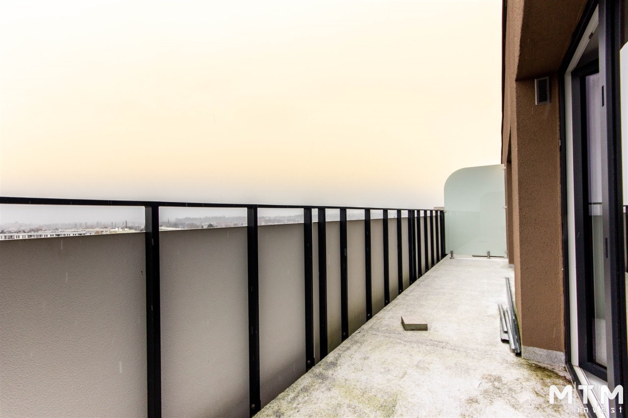 Na taras wyjście zarówno z salonu, jak i z sypialni. Z góry rozpościera się otwarta panorama miasta.