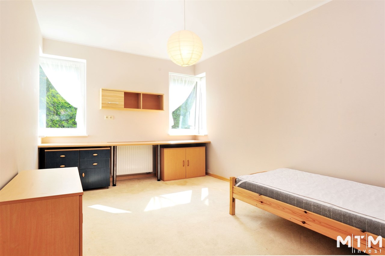 - Sypialnia (14m2) od strony wschodniej z dwoma oknami i widokiem na ogród przynależny do mieszkania. Pokój idealny dla 2 dzieci. Na podłodze wykładzina podłogowa. Łóżko 200x80. Szafki. Dużo biurko dla 2 osób.