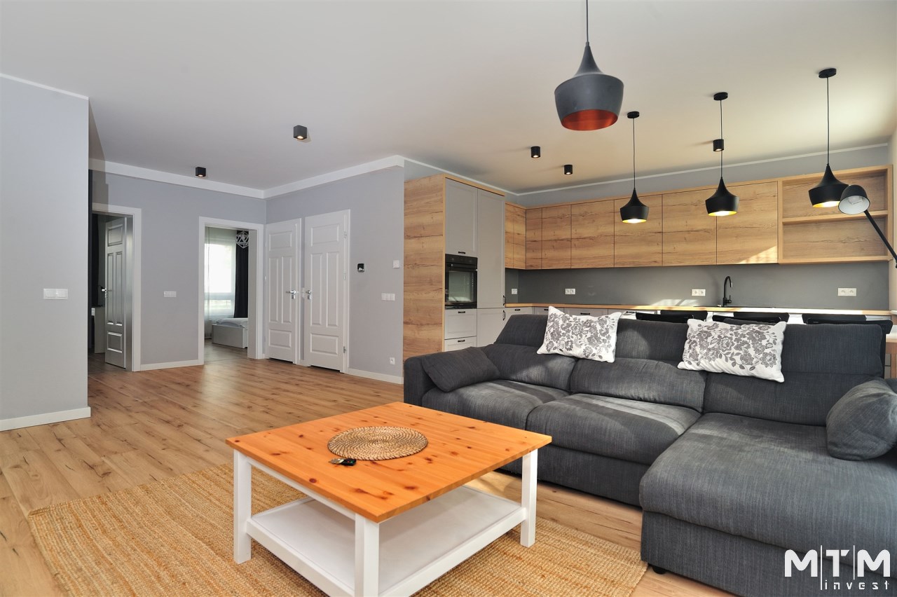 Salon dzienny z aneksem kuchennym, 3 sypialnie, hol, łazienka z kabiną prysznicową oraz toaleta.